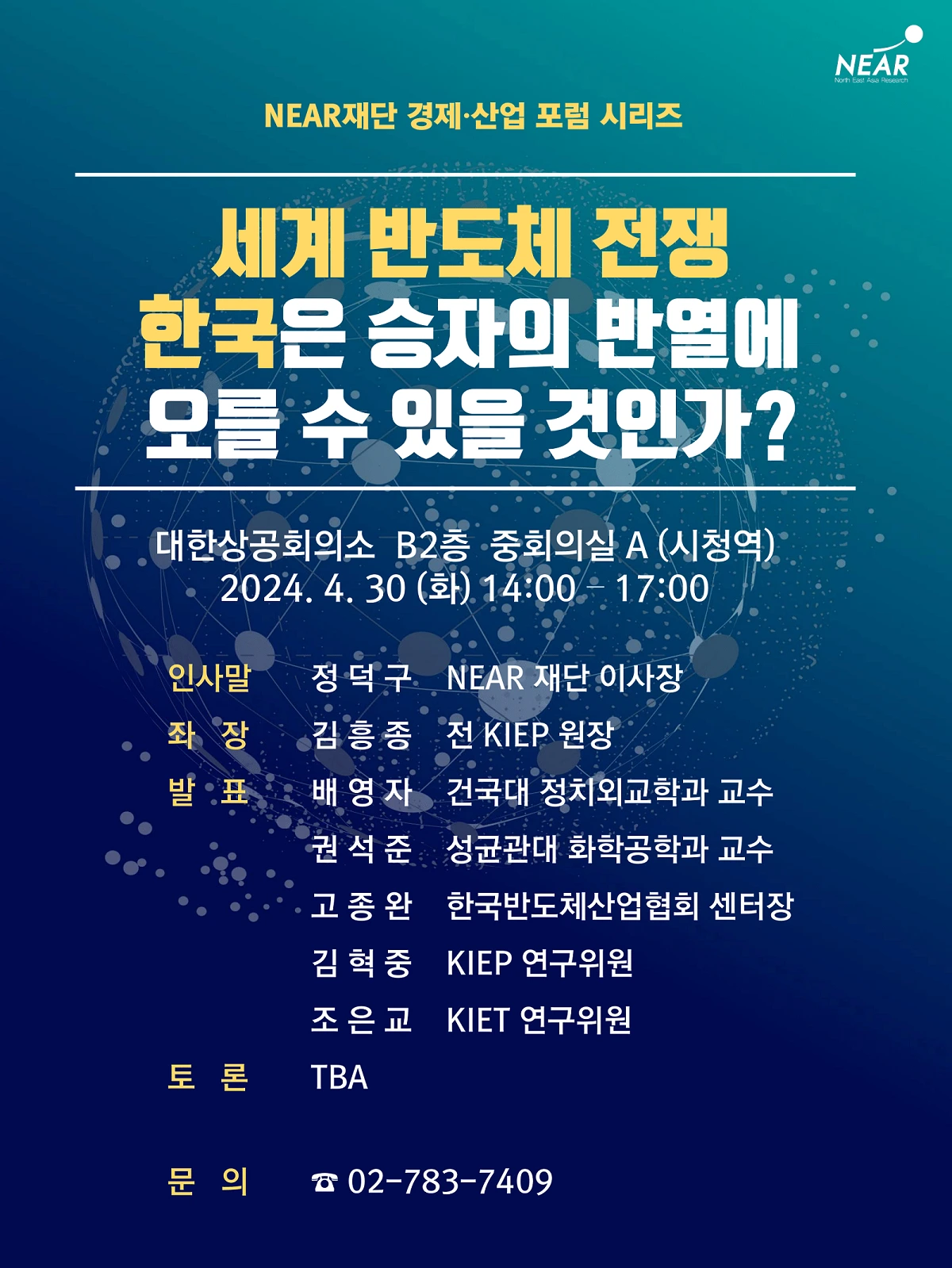 30일 민간 싱크탱크 니어재단이 '세계 반도체 전쟁, 한국은 승자의 반열에 오를 수 있을 것인가'를 주제로 연 경제산업 포럼에서 산업 분야 석학들은 핵심 전략물자인 반도체를 둘러싼 총성 없는 전쟁이 펼쳐지고 있다고 진단했다. 특히 경쟁국이 보조금을 포함한 대규모 인센티브를 제공하는 점을 참고해 한국 정부도 특단의 조치를 취해야 한다고 입을 모았다.