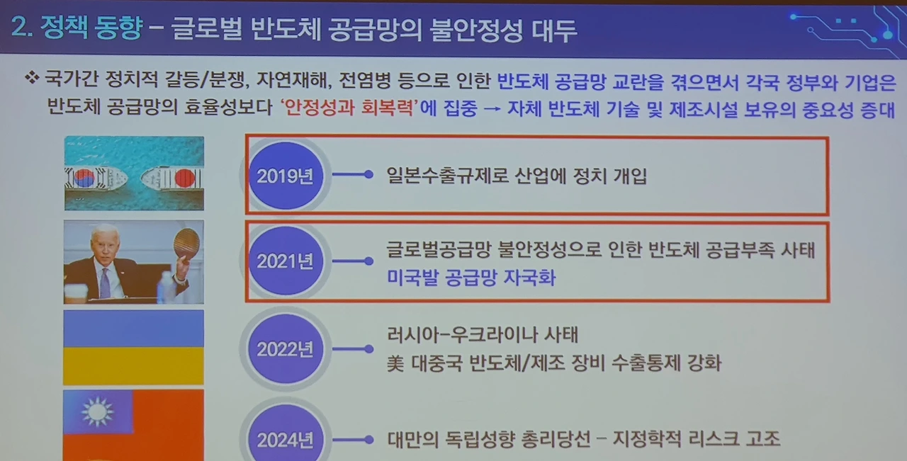 막대한 보조금을 주며 반도체 공장을 유치하는 '반도체 전쟁'이 한창이다. 미국 정부의 '칩스법'이 촉발한 경쟁이다. 미국은 자국 내에 반도체 공장을 짓는 기업들에 보조금 혜택을 제공하는 칩스법을 2022년 8월 도입했다. 이로 인해 한국, 대만, 일본을 비롯한 동아시아에 집중됐던 반도체 생산공장이 미국으로 옮겨가고 있다. 세계 반도체 공급망에서 한국의 위상이 흔들리고 있다는 위기감이 커지고 있다. 한국도 바뀐 환경에 맞춰 산업 전략과 지원책을 새롭게 짜야 하는 상황이다.