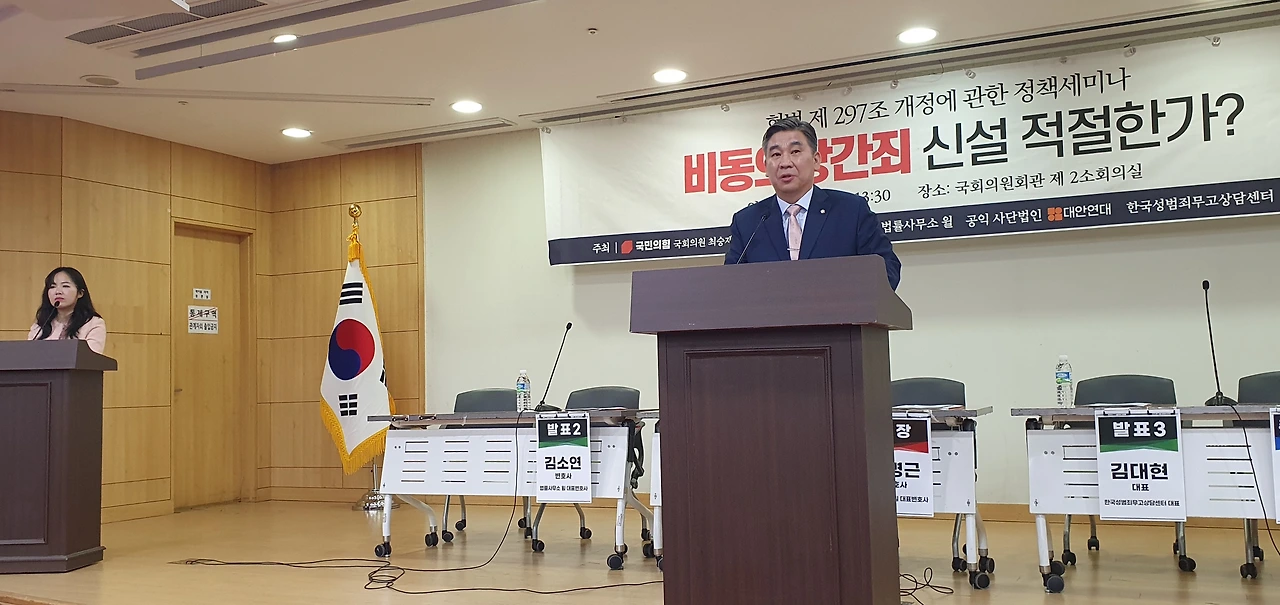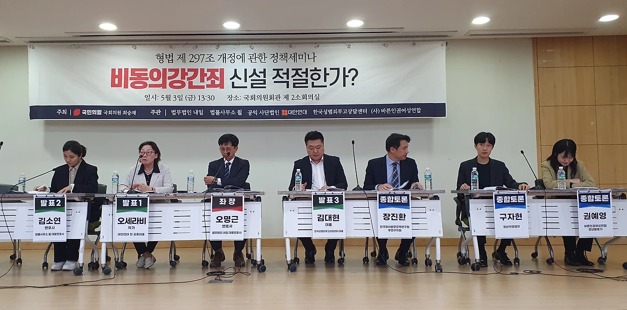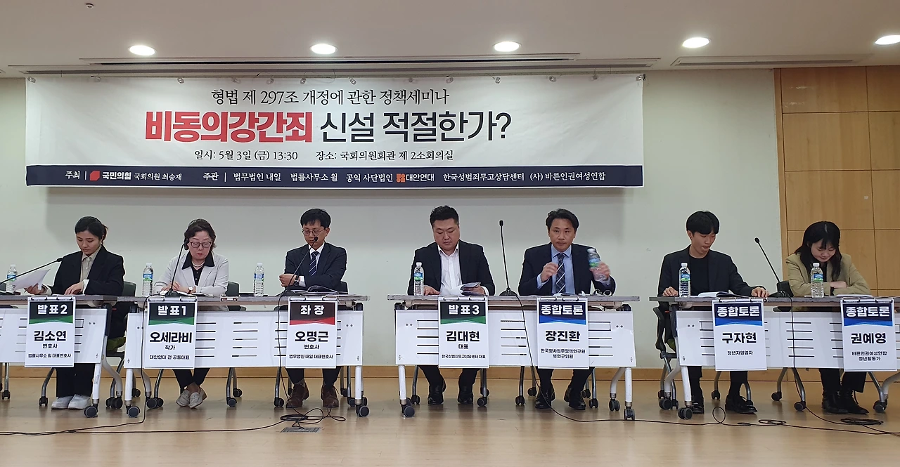이어 “쉬운 길은 없다. 양쪽의 진술을 많이 하게 해서 진술을 찾아가는 과정, 신중한 과정에 필요한 것이 진술만을 토대로 진실을 찾아가는 과정 필요하다”며 “(비동의강간죄의) 찬반 때문에 온 게 아니다. 진지한 노력, 진지한 문제제기, 성범죄의 진실을 어떻게 캐내느냐에 대한 전반적인 진지한 고민이 필요하다는 생각에서 이 자리가 필요하다고 봤다. 어렵기도 하고, 위험한 주제이기도 하다. 이런 주제를 국회에서 공개적으로 토론할 기회를 주신 최승재 의원께 존경 표한다”라고 했다.