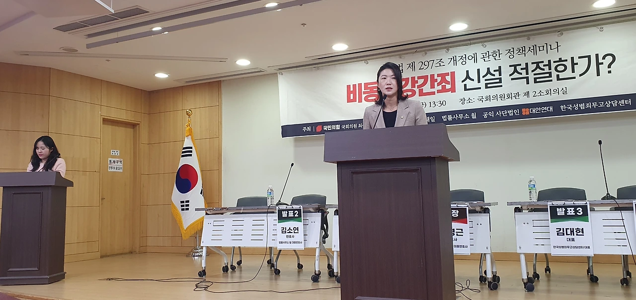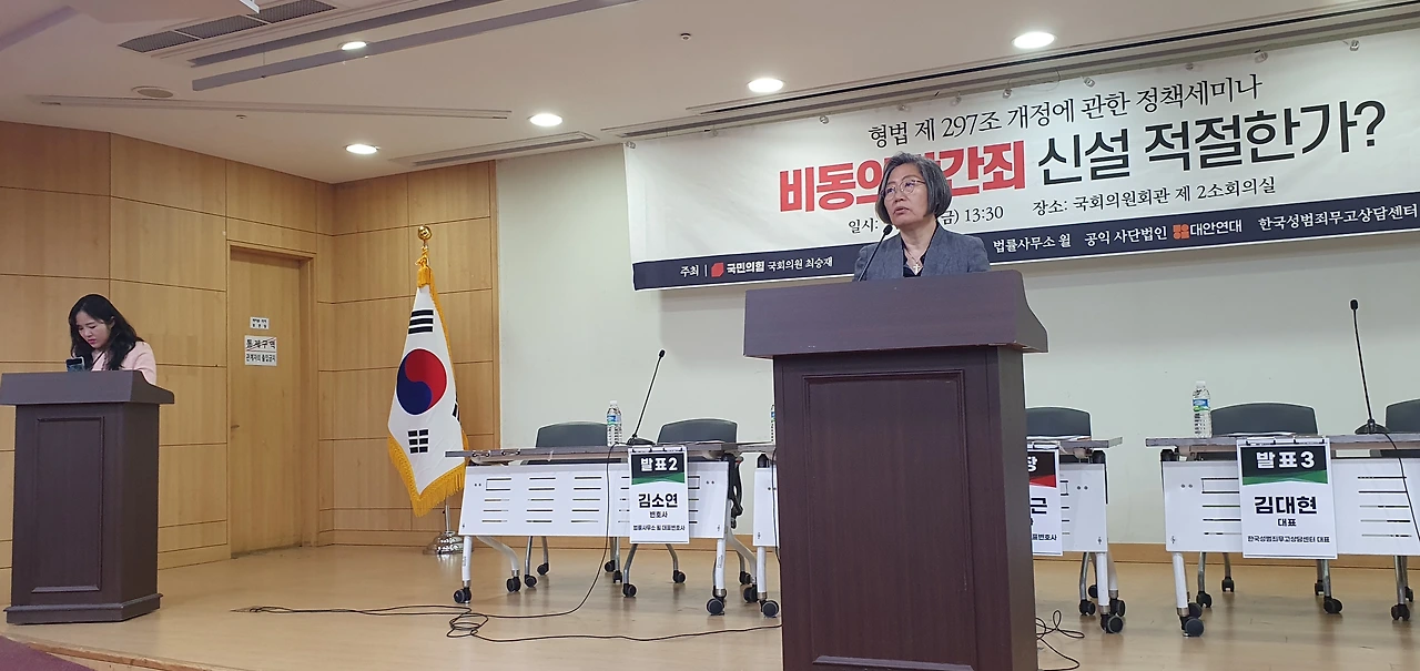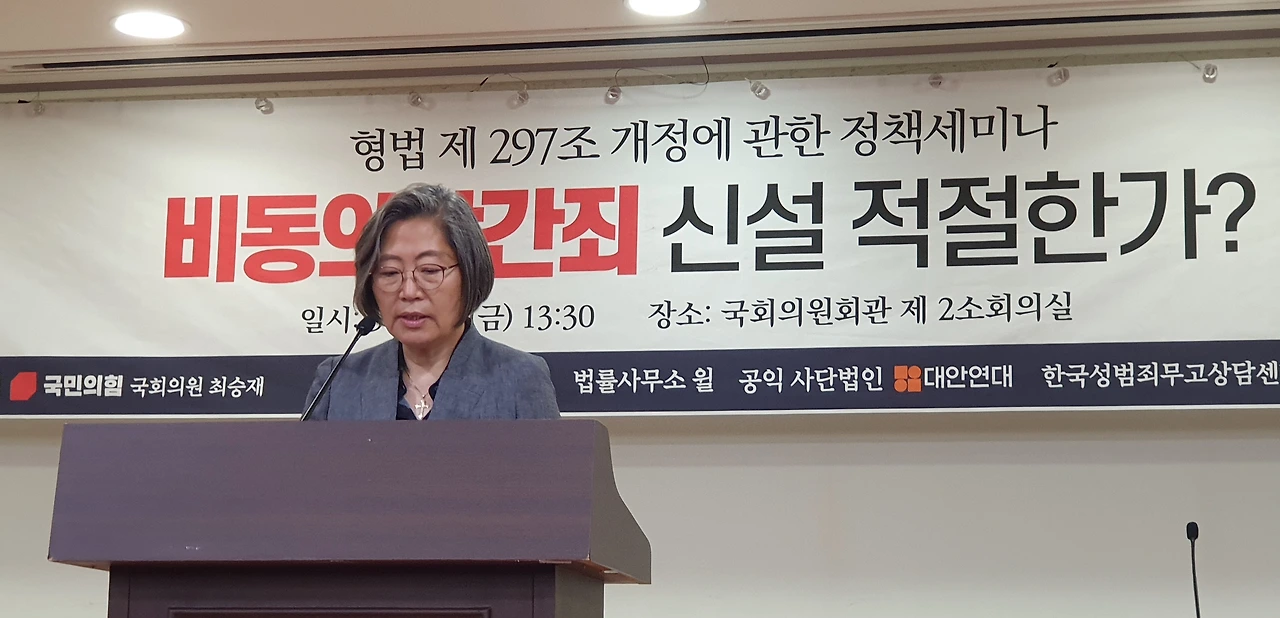 그러면서 "동의를 했나, 안 했나 이것도 굉장히 여성들을 수동적인 위치에 놓는다. 이것이야말로 반 여성주의가 아닌가"라며 "이것을 거부할 권리 일부도 없다는 말인가. 여성을 굴종적인 위치에 놓기 때문에 정말 이것이 발의된다면 의원님들은 반드시 여러 가지를 고려해서 신중을 기해주시기를 부탁드린다"고 강조했다.