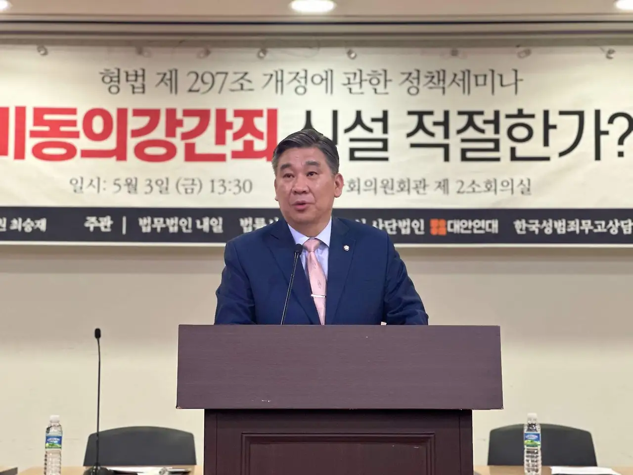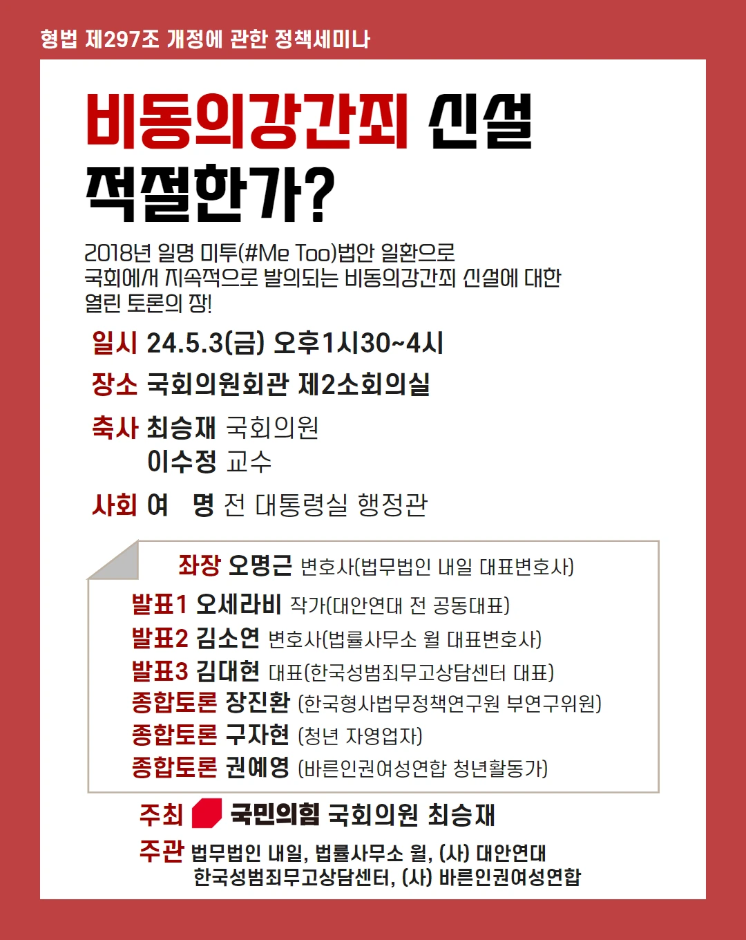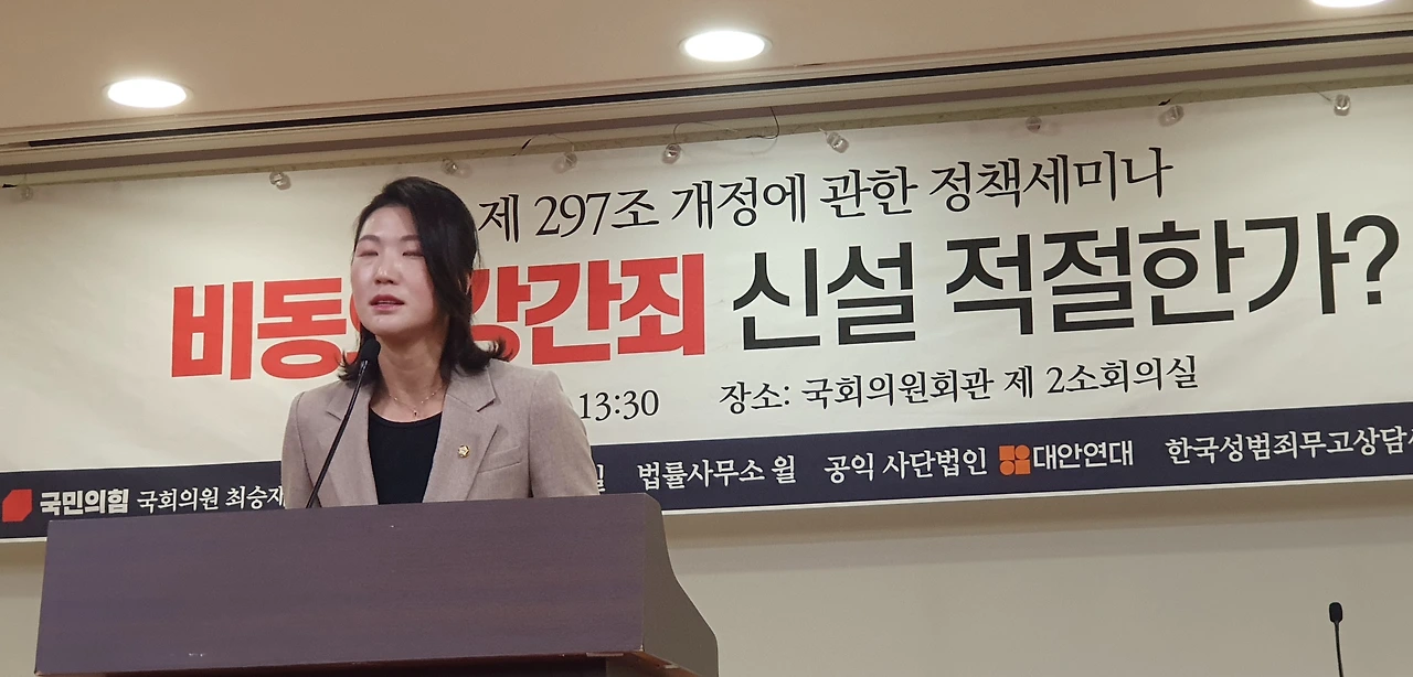 최승재 국민의힘 의원실은 3일 의원회관에서 '비동의강간죄 신설 적절한가?' 형법 297조 개정에 관한 정책 세미나를 개최했다. 사회는 여명 전 대통령실 행정관이 맡았다.