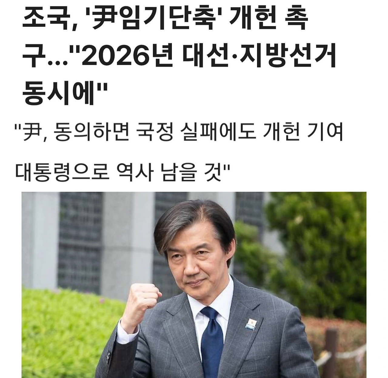 하지만 그것이 여야 정치권을 물론 국민 전체의 공감 속에 실제로 이뤄지려면, 무엇보다 지금 조국의 주장처럼 현직 대통령의 임기를 단축해 희생시키는 그런 방식으론 결코 성사시킬 수 없다고 보고 있는 것이다.