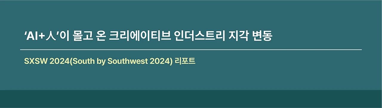 ☑️ 생성형 AI 기술의 가속화로 크리에이티브 산업계는 지각변동을 겪고 있다. 소비자와 상호작용을 통한 콘텐츠 제작이 가능해지며, 영화, 게임, TV 프로그램 등의 콘텐츠가 개인화한 맞춤형으로 빠르게 변화하고 있다. 최근 한류로 대표되는 K-콘텐츠가 세계적으로 주목받고 있는 가운데, 우리나라는 SXSW 2024에서 한국공동관을 운영하며 비즈니스 상담 총 199건, 수출 상담액 1,661만 달러(한화 약 219억 원)를 기록했다고 한다.⁵ 기술의 발전으로 새롭게 열리고 있는 미래 기회에 보다 많은 관심과 투자가 필요하다.