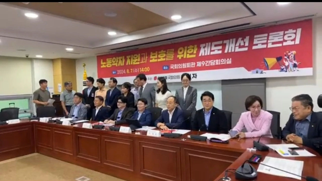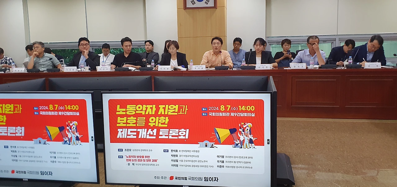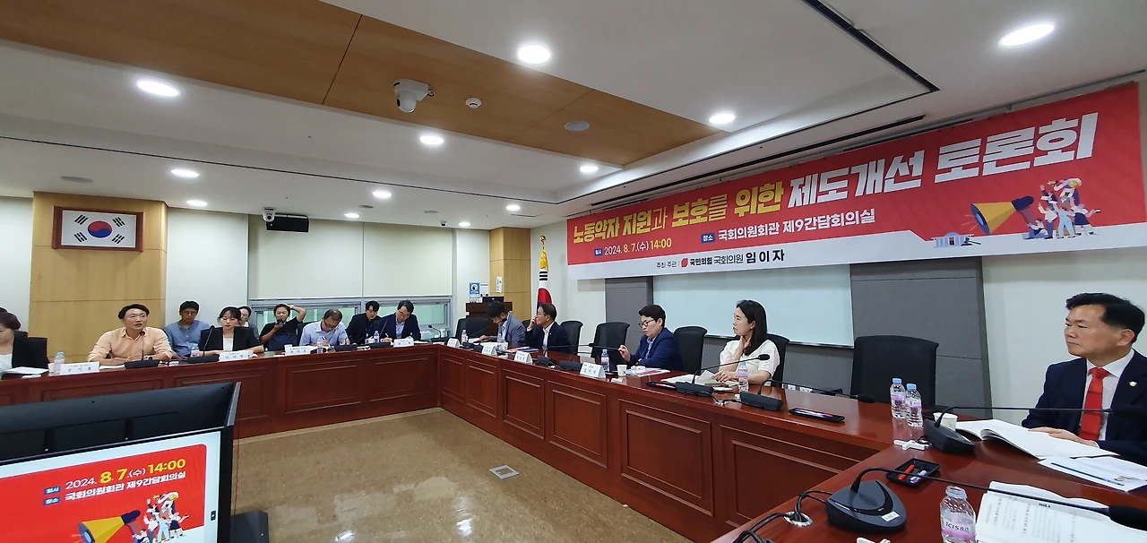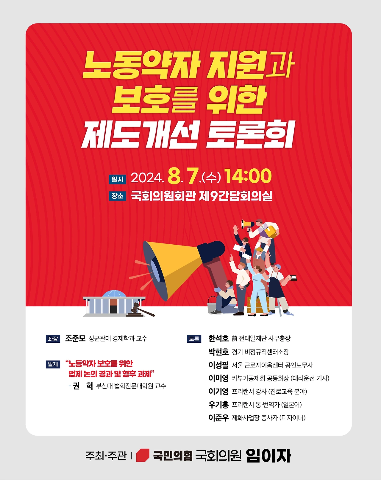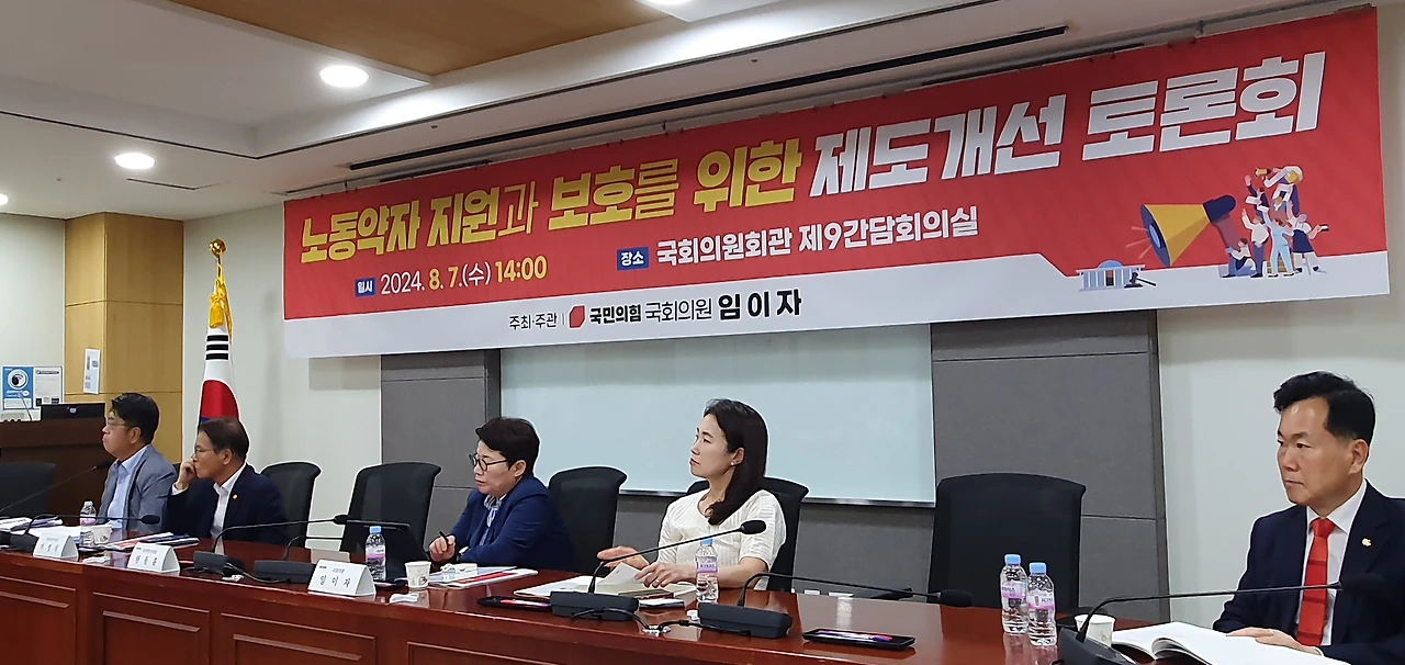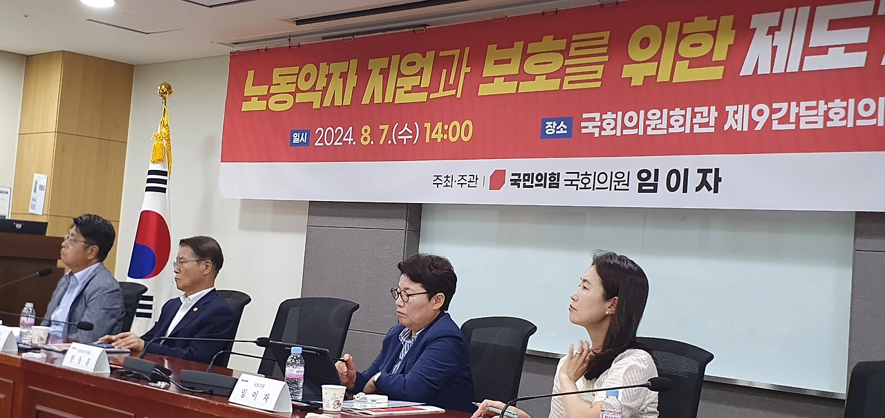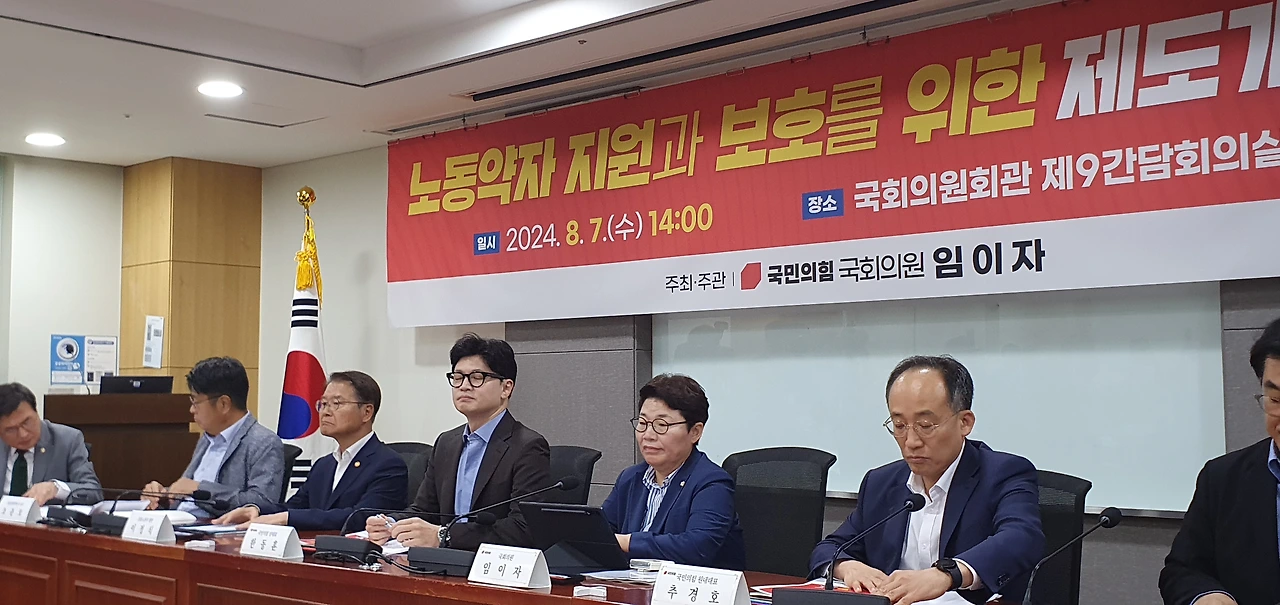 임 의원은 “4차 산업혁명으로 촉발된 노동시장 변화로 사회안전망 사각지대에서 충분히 보호받지 못하는 이들에 대한 대책 마련이 시급하다”며 “한국의 임금근로자가 2200만명이지만, 노조법 2·3조 개정안(노란봉투법)이 노조에 가입된 240만명을 위한 것이라면 노동약자보호법은 노동법 보호 범위에 들어올 수 없지만 사회적 보호가 필요한 지원법”이라며 “노동약자보호법 제정을 적극 추진하겠다”고 밝혔다.