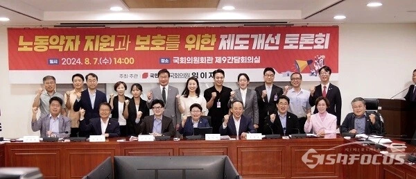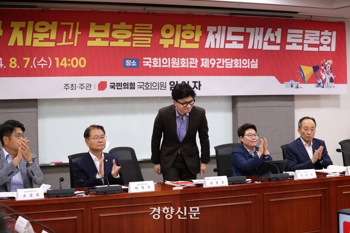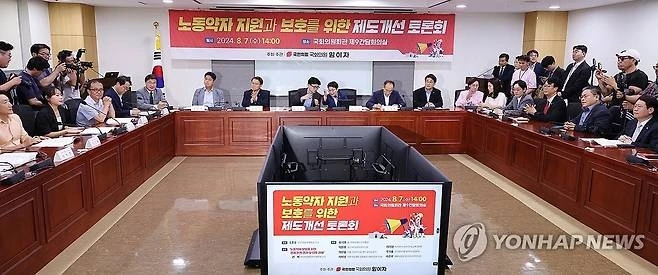 국민의힘이 프리랜서 근로자, 배달 라이더 등 노동법의 사각지대에 있는 노동약자 보호를 제도화하기 위한 대규모 토론회를 7일 국회에서 열었다. 한동훈 대표와 추경호 원내대표, 이정식 고용노동부 장관 등이 참석했다. “노동시장 이중 구조 해소를 위해 ‘노동약자 지원과 보호를 위한 법률(노동약자보호법)’을 제정하겠다”는 윤석열 대통령의 약속을 구체화하기 위한 움직임으로 평가된다.
