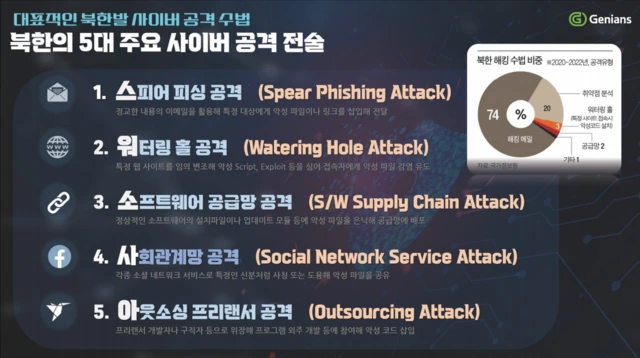또 문 센터장은 북한이 크게 5가지 해킹 기법을 사용하고 있다고 했다. 북한발 5대 주요 사이버 전술로는 ▲이메일을 통한 스피어 피싱 공격 ▲웹사이트에 악성 코드를 삽입하는 워터링 홀 공격 ▲소프트웨어 공급망 공격 ▲SNS를 통한 공격 ▲IT 종사자로 위장해 공격하는 방식 등을 통해 정교화되고 복잡화된 방식으로 발전하고 있다고 말했다.