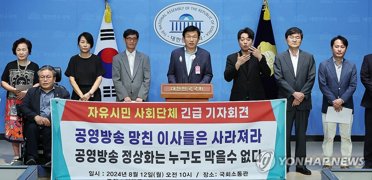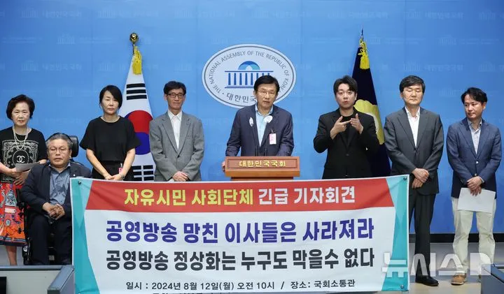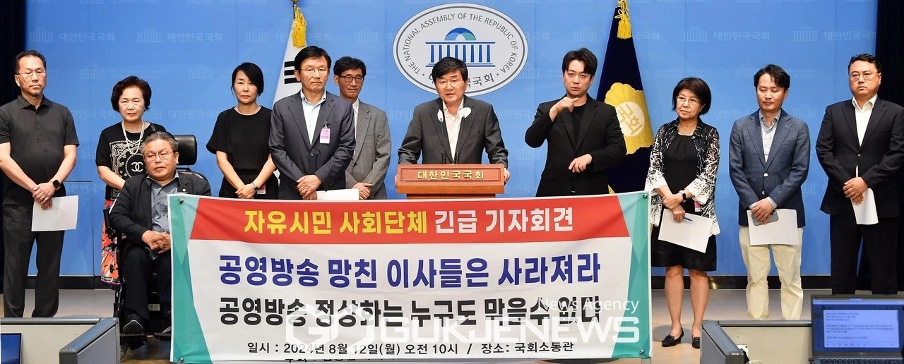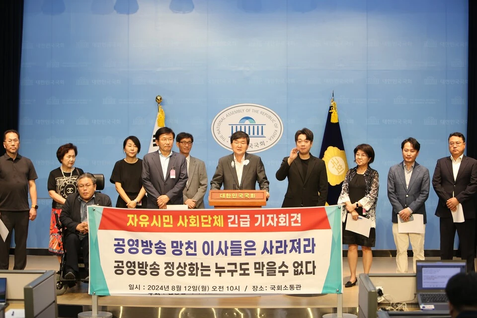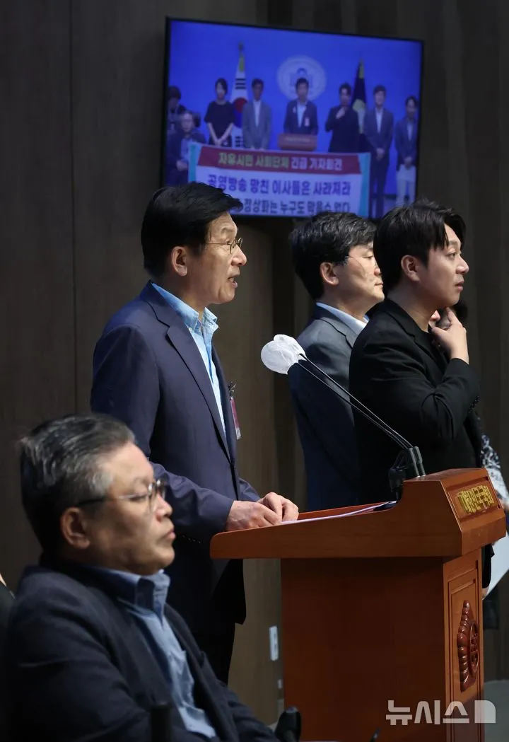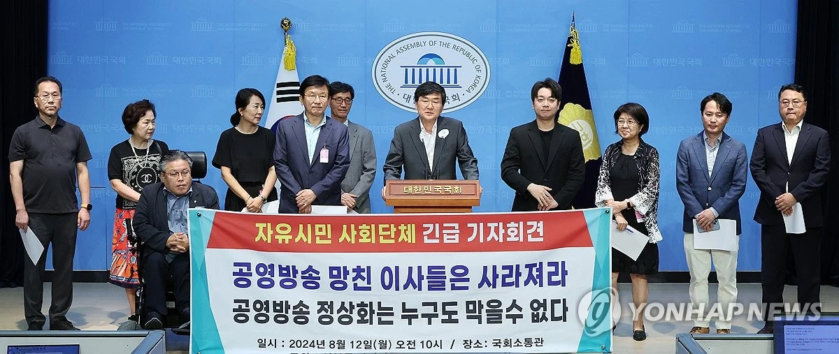 자유언론국민연합(공동대표 박인환·이준용·이철영)은 12일 오전 여의도 국회 소통관에서 기자회견을 열고 "방송통신위원장과 부위원장 '2인체제'에서 공영방송 이사를 선임한 것은 '법 위반'이라고 주장하는 민주당 주도의 국회 과방위는 오는 14일과 21일 추가 청문회를 열기로 결정했다"며 "과방위가 채택한 증인 명단에는 지난달 31일 새로 선임된 KBS 이사 7명과 방문진 이사 6명이 포함됐고, 현재 직무정지 상태인 이진숙 방통위원장, 김태규 부위원장(위원장 직무대행), 조성은 사무처장, 김영관 기획조정관 등 방통위 관계자 9명도 증인으로 채택됐다"고 밝혔다.