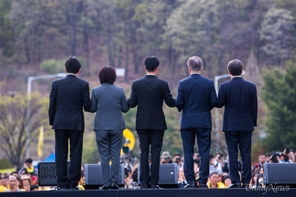 ▲ 2017년 대선의 추억... 세월호 3주기인 16일 오후 경기도 안산 단원구 세월호참사 희생자 정부합동분향소 앞 무대에서 추모식에 참석한 대선후보들이 전명선 세월호 가족협의회 운영위원장(가운데)과 함께 손을 잡고 인사를 하고 있다. 오른쪽 부터 국민의당 안철수, 더불어민주당 문재인 대선후보, 전명선 세월호 가족협의회 운영위원장, 정의당 심상정, 바른정당 유승민 대선후보. ⓒ이희훈