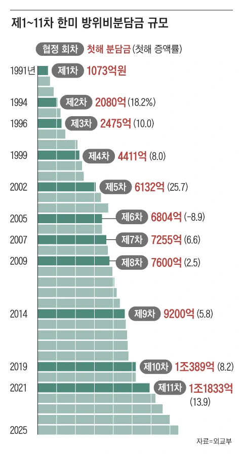 2010년 당시 7904억원이던 한국의 방위비 분담금은 2019년(1조 389억원)에 처음 1조원을 넘었다. 9년 동안 총 2100억원 정도 증가해 매년 233억원 정도씩 늘었다. 2023년 한국의 방위비 분담금(1조 2896억원)은 그해 한국 총국방비(57조원)의 2.2%, 대미 무역흑자(약 60조원)의 2.1% 정도다. 같은 해 한국 정부 총예산(638조 7000억원)의 0.2% 수준이다. 주한미군이 한반도 평화와 한국 방어에 필수적인 존재라고 인정한다면, 많은 비용 부담이라고 단정할 수 있을지 의문이다.