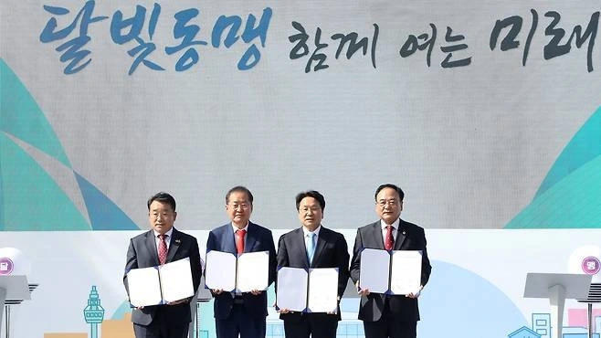 2023년 4월 17일 오후 전북 남원시 광주대구고속도로 지리산휴게소(광주방향)에서 열린 '대구-광주 공항특별법 동시 통과 기념행사'에서 정무창 광주시의회 의장, 홍준표 대구시장, 강기정 광주시장, 정만규 대구시의회 의장(왼쪽부터)이 2038 하계아시안게임 공동 유치와 달빛고속철도 예타면제 특별법 공동 추진을 위한 업무협약을 체결한 뒤 기념촬영을 하고 있다./뉴스1