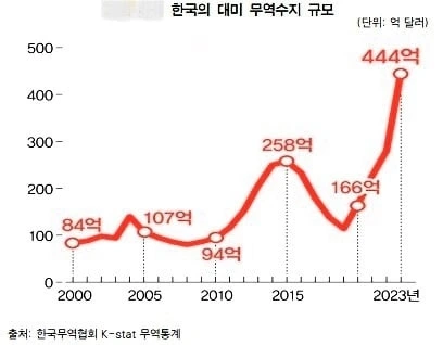 2000년 이후 한국의 대미 무역 흑자 추이. 한국은 24년 동안 매년 무역 흑자를 내고 있다.