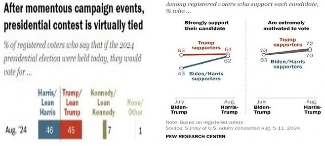 미국 퓨리서치 센터가 2024년 8월 14일 공개한 트럼프와 해리스에 대한 지지도 조사. 해리스는 이번 조사에서 트럼프를 근소하게 앞섰다(왼쪽 그래프). 그러나 '강한 지지층'과 '반드시 투표하겠다'는 의향 조사에선 트럼프가 해리스보다 각각 2%포인트 앞서 있다(오른쪽)고 퓨리서치 센터가 밝혔다./Pew Research Center