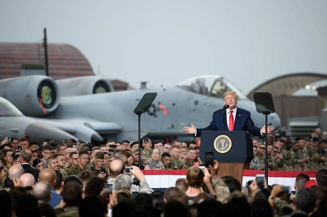 2019년 6월 30일 도널드 트럼프 당시 미국 대통령이 1박 2일간의 한국 방문 일정을 마무리하고 귀국하기 직전 경기도 오산 미군 공군기지에 주둔하고 있는 미군 장병들을 찾아가 격려연설하고 있다./조선일보DB