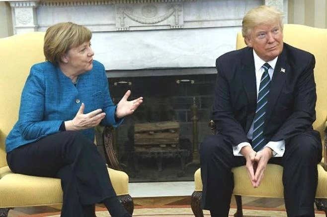 앙겔라 메르켈 당시 독일 총리(왼쪽)가 2017년 3월 17일(현지시각) 백악관 오벌 오피스에서 도널드 트럼프 당시 미국 대통령과 첫 정상회담을 하고 있다. 트럼프 대통령은 메르켈 총리 반대쪽을 보면서 사실상 그를 외면하고 있다./조선일보DB
