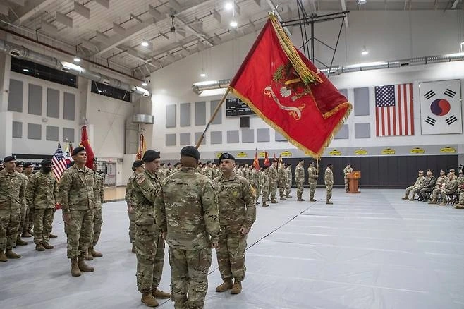 2022년 12월 7일 경기도 동두천시 캠프 케이시에서 열린 주한미군 2사단 예하 210포병여단 순환배치연대 임무교대식에서 미군 장병이 연대 깃발을 펼쳐 올리며 임무 시작을 알리고 있다./연합뉴스