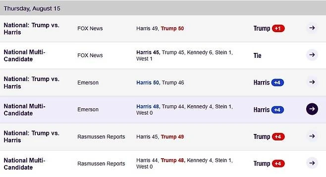 2024년 8월 15일 미국 리얼 클리어 폴리틱스(Real Clear Politics)가 취합해 발표한 미국 대선 주요 여론조사 결과. 폭스 뉴스와 라무센리포트 등에서 여전히 트럼프가 앞서 있다./Real Clear Politics