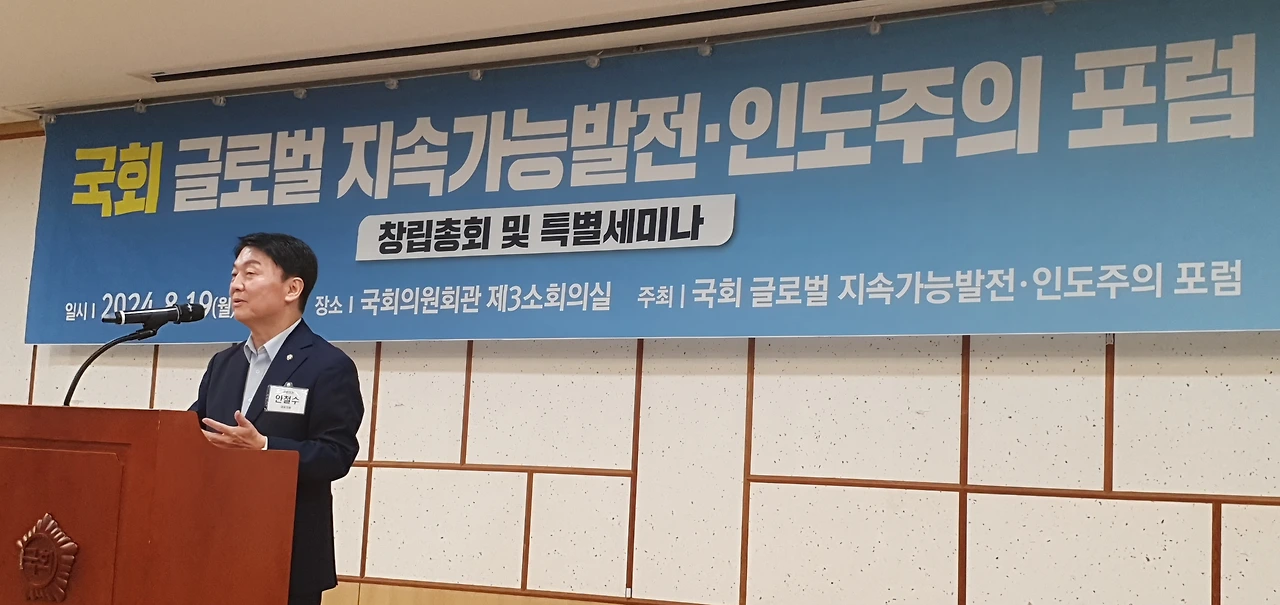 국회 외교통일위원회 소속 안철수 국민의힘 의원은 19일 의원회관에서 첫 개최된 '국회 글로벌 지속가능발전·인도주의 포럼' 창립총회 및 특별세미나에서 "4선을 하면서 여러 연구모임을 만들었는데 이렇게 많고 다양한 백그라운드에서 (오신 분들이) 한 자리에 모인 것은 처음"이라며 "지금 인류가 닥친 위기 때문"이라고 강조했다.
