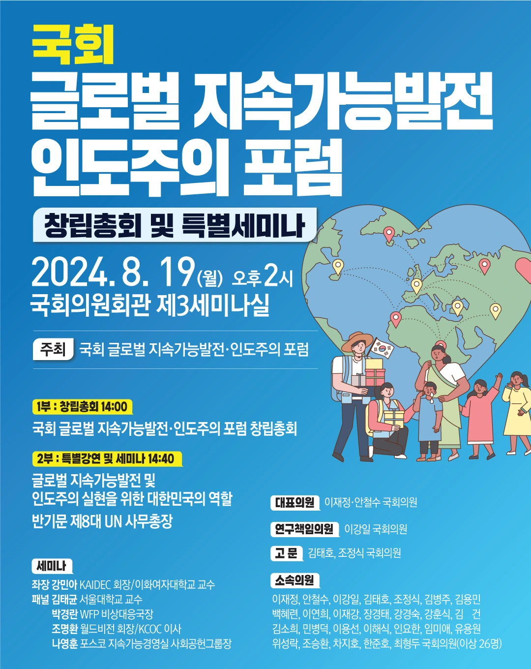 국회 글로벌 지속가능발전·인도주의 포럼은 국회 외교통일위원회 소속 이재정 더불어민주당 의원과 안철수 의원 주도로 설립됐다. 21대 국회 때부터 논의가 돼왔으며, '세계 인도주의의 날'인 이날을 시작으로 첫 발을 뗐다.