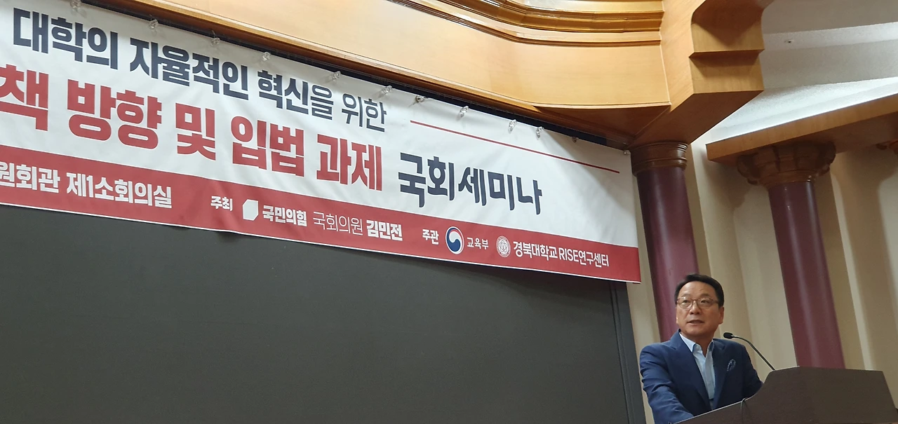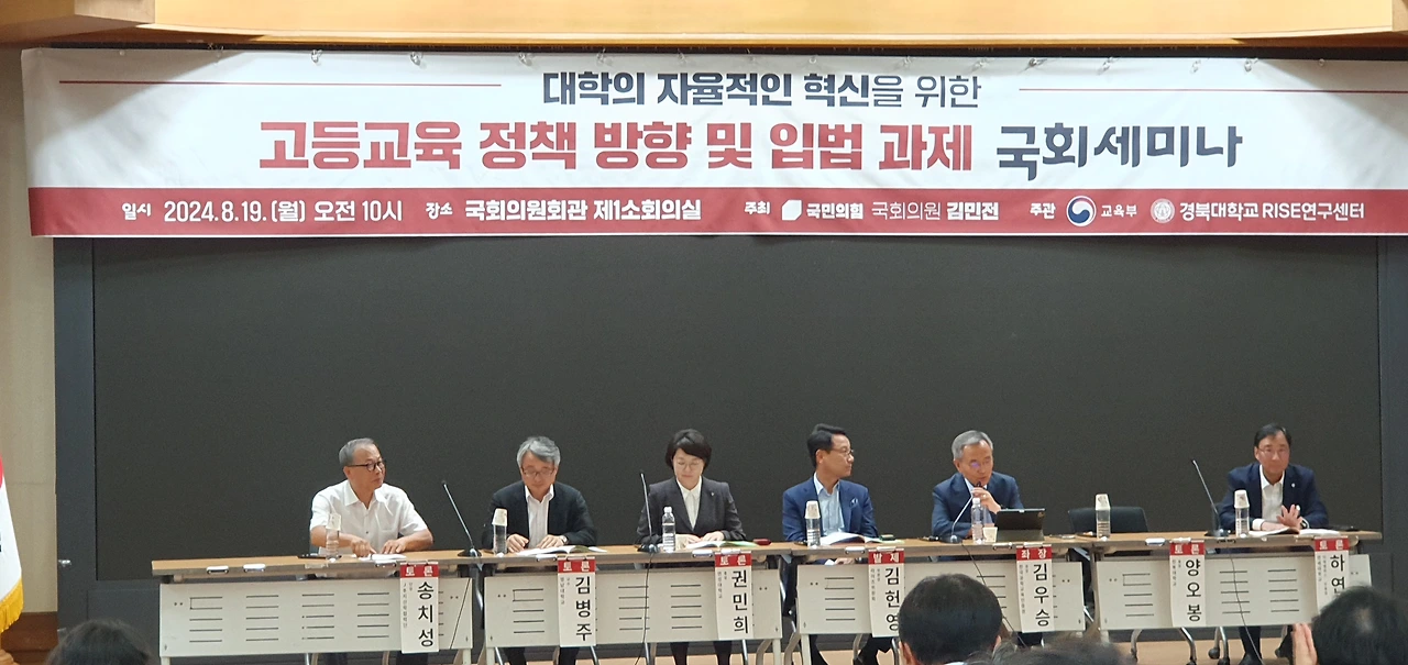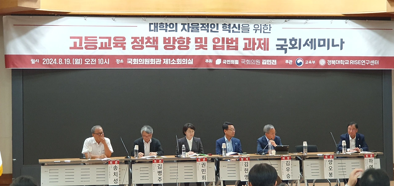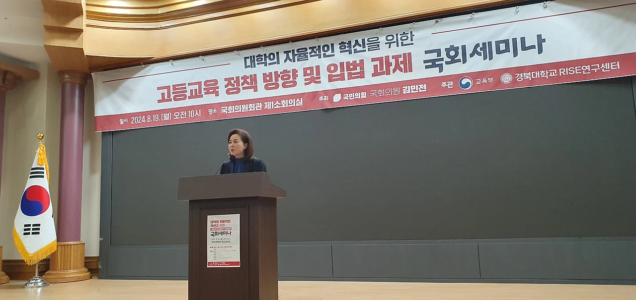 「고등교육 정책방향 및 입법과제 국회세미나」는 변화하는 시대에 발맞춰 대학의 자율적인 혁신을 도모하고, 지역과 대학 간 상생 발전 모델 구축을 위한 방안을 모색하기 위해 국민의힘 김민전 의원실이 주최하고, 교육부와 경북대학교 RISE연구센터가 공동 주관했다.