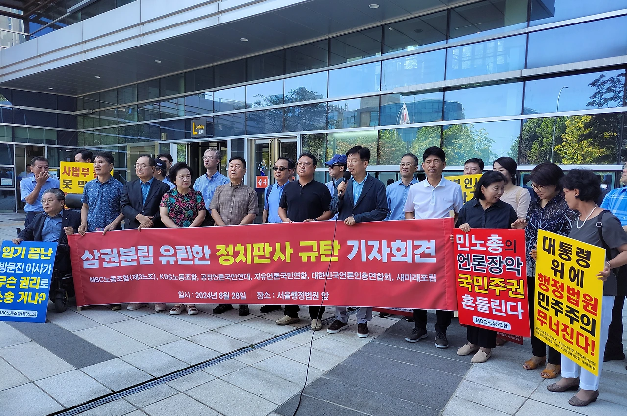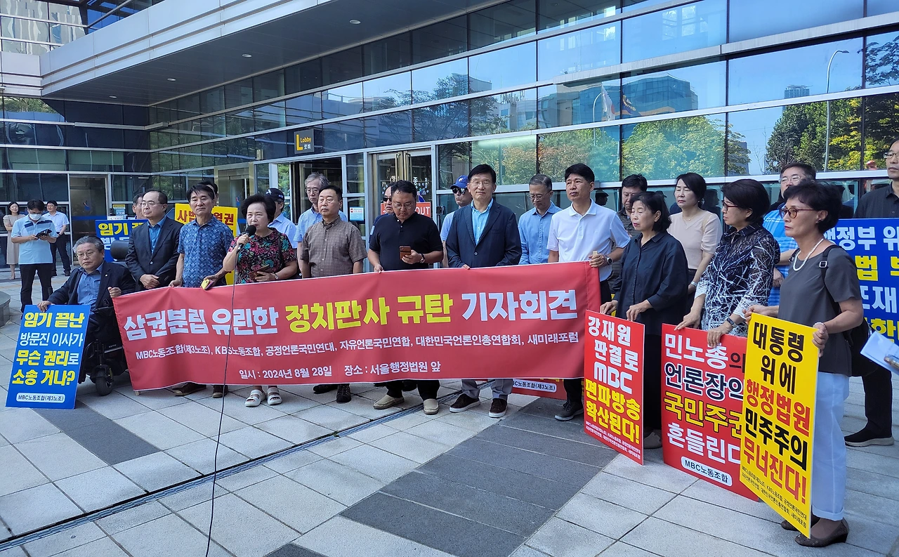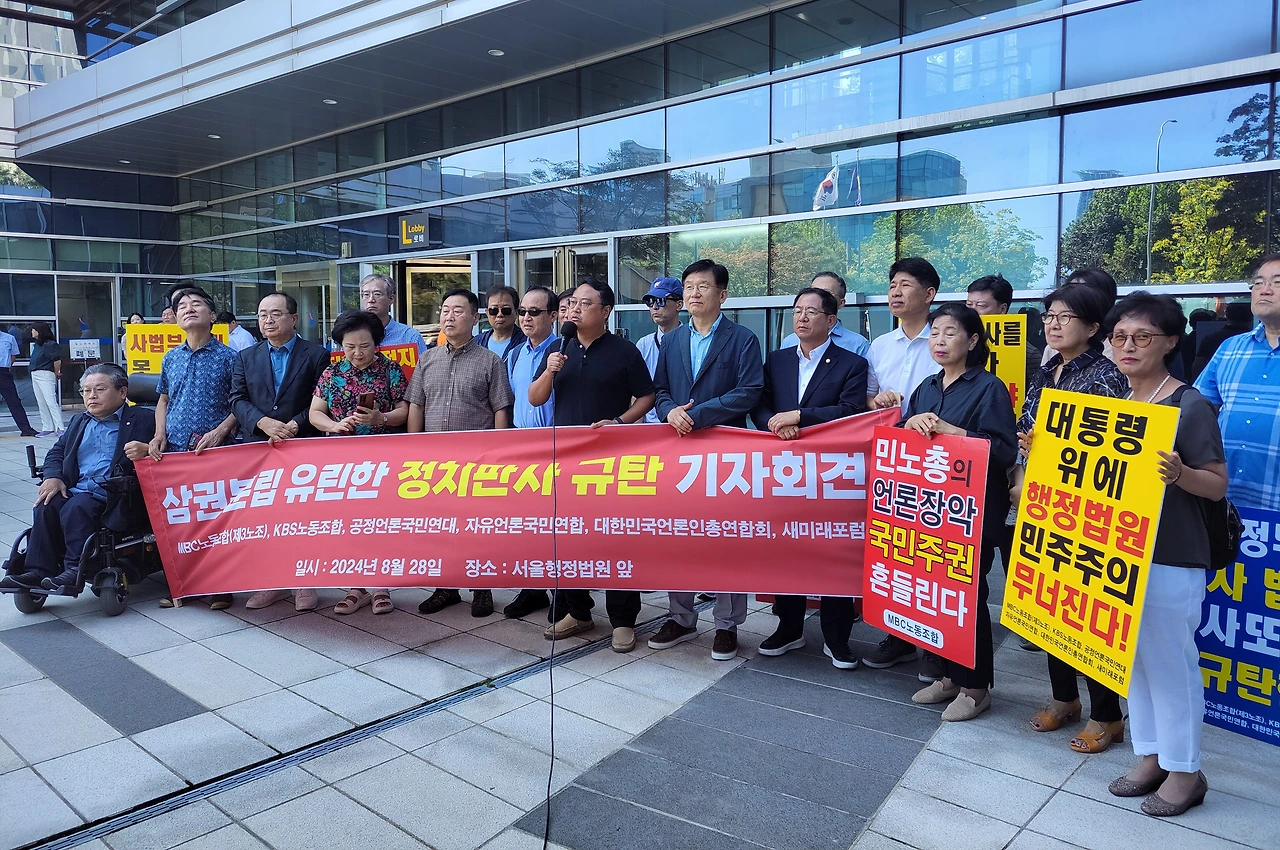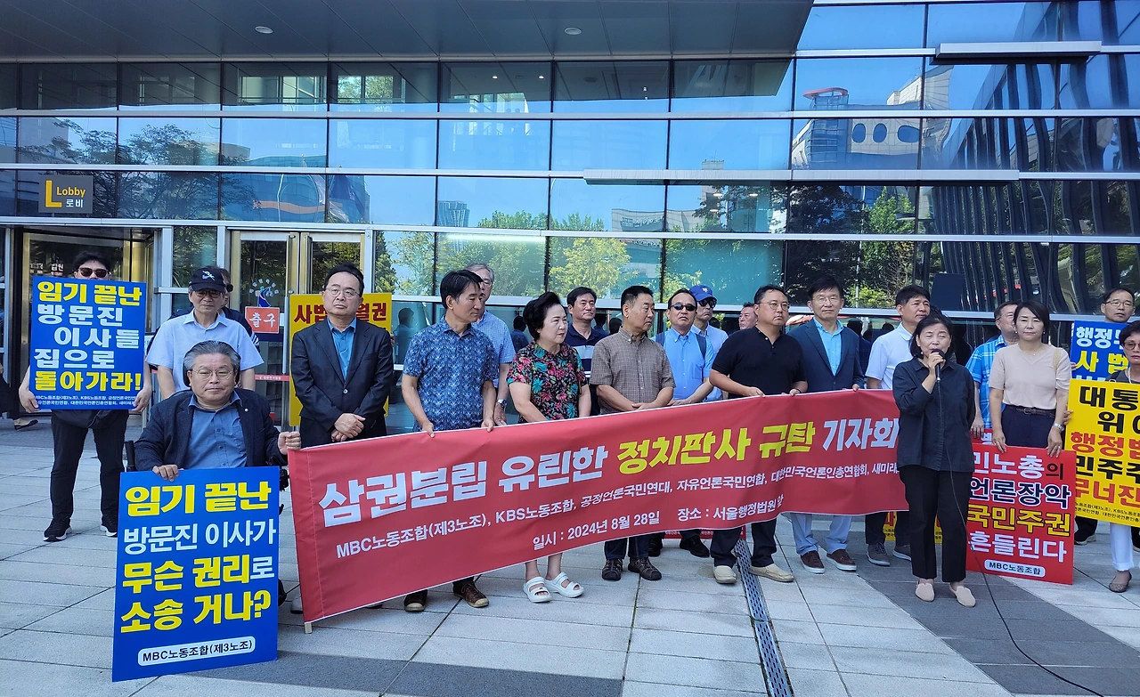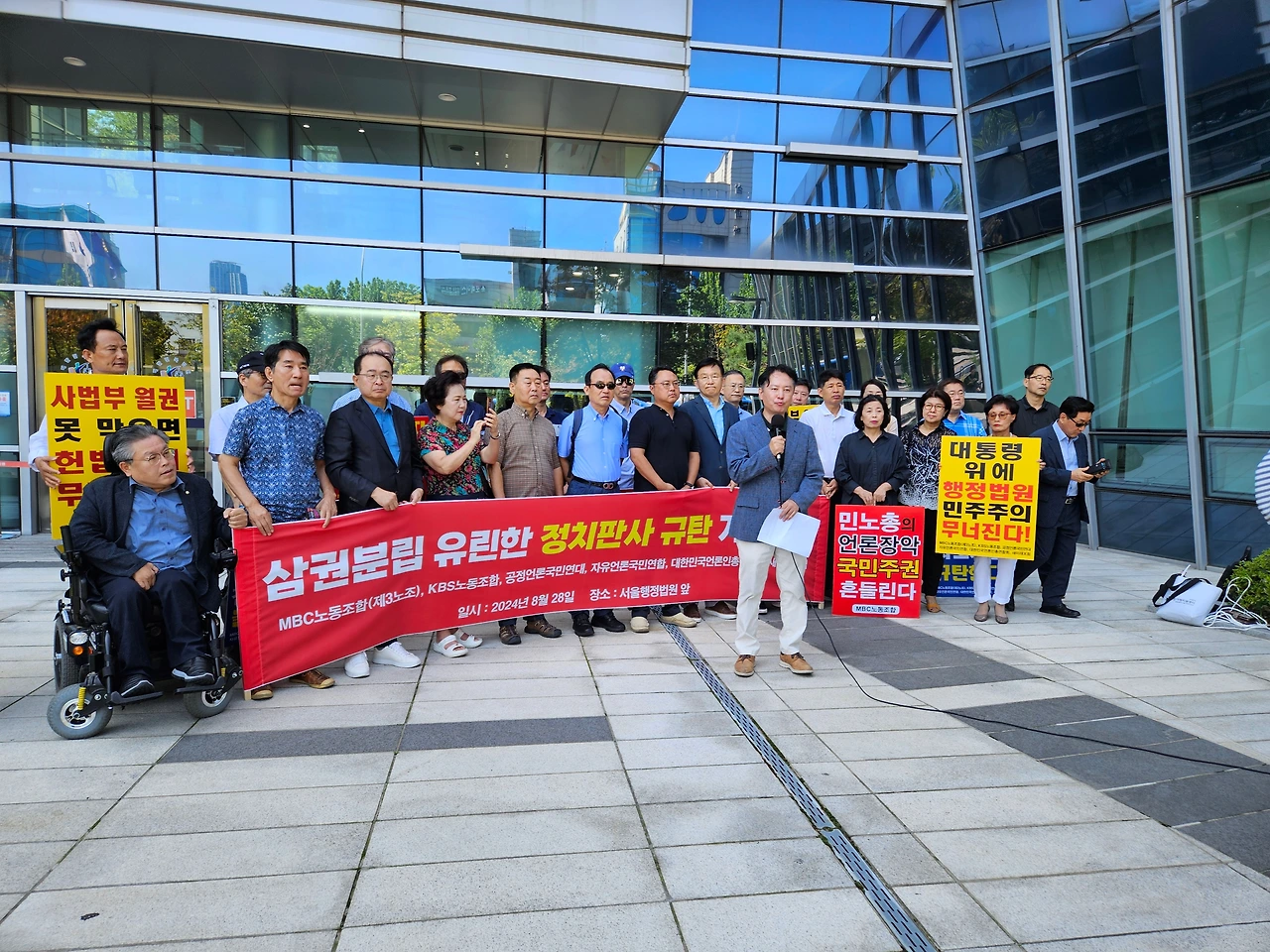 MBC노동조합(3노조)과 KBS노동조합(1노조), 공정언론국민연대(공언련), 대한민국언론인총연합회(언총), 자유언론국민연합, 새미래포럼 등 '공영방송 정상화 운동'을 벌이고 있는 언론·시민사회단체 회원들은 28일 오전 11시 서울 서초구 서울행정법원 앞에 모여 "'정치판사'의 '정치적 판결'을 강력 규탄한다"고 목소리를 높였다.