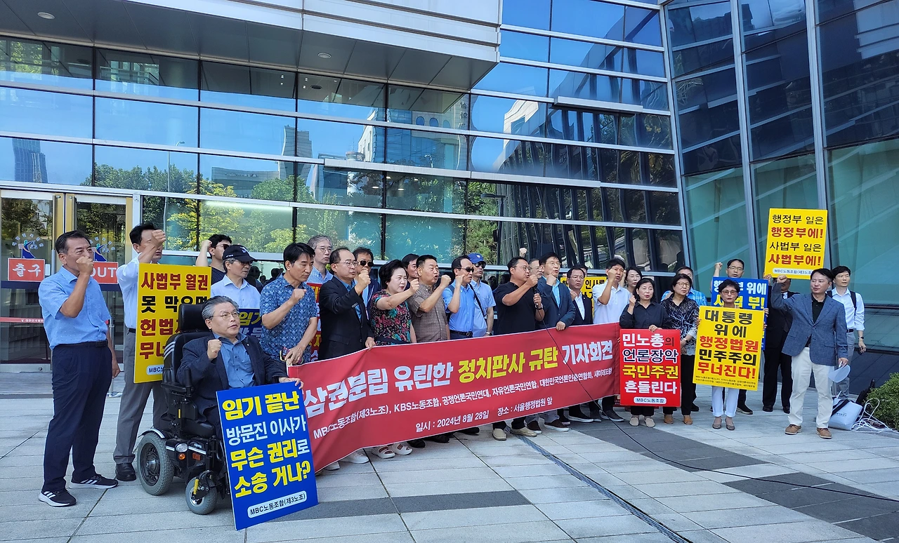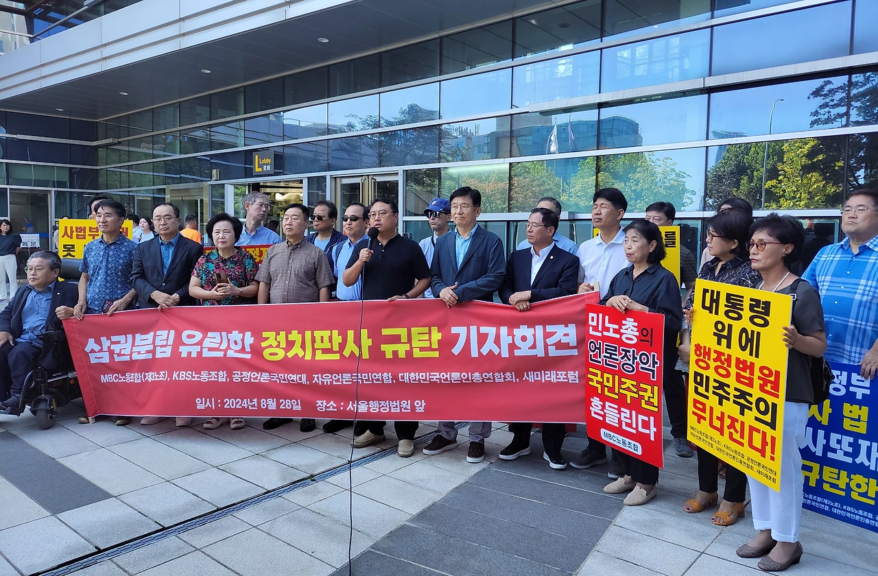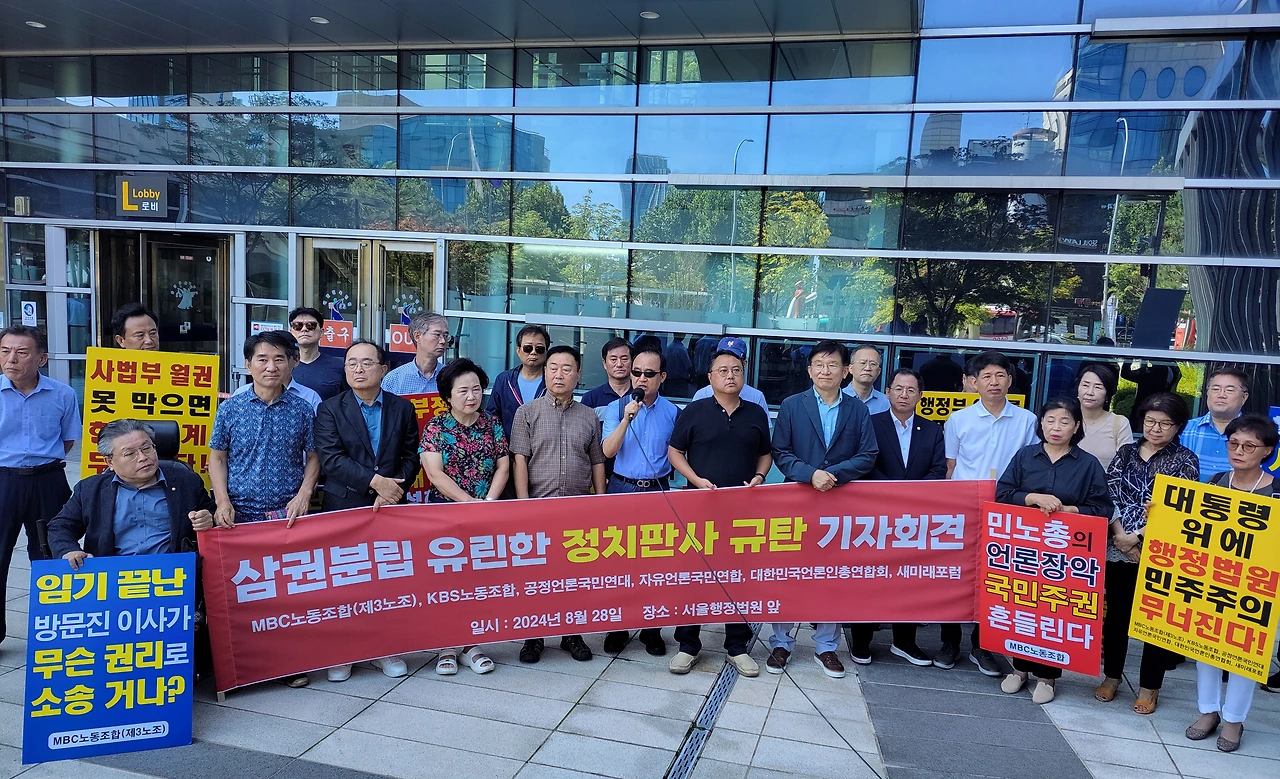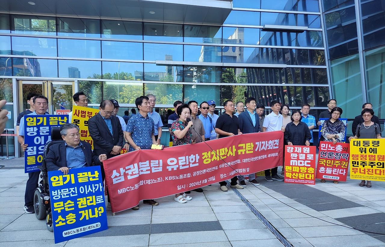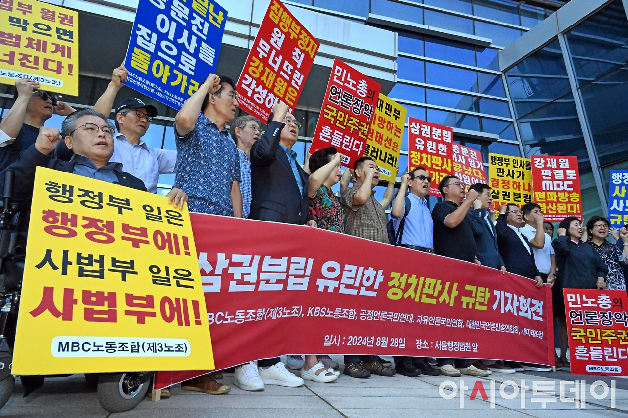 MBC노동조합(3노조)과 KBS노동조합(1노조), 공정언론국민연대(공언련), 대한민국언론인총연합회(언총), 자유언론국민연합, 새미래포럼 등 '공영방송 정상화 운동'을 벌이고 있는 언론·시민사회단체 회원들은 28일 오전 11시 서울 서초구 서울행정법원 앞에 모여 "'정치판사'의 '정치적 판결'을 강력 규탄한다"고 목소리를 높였다.