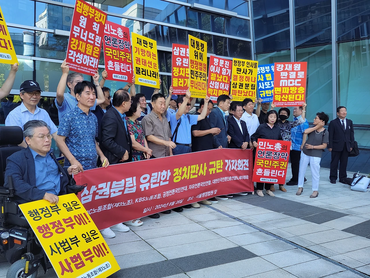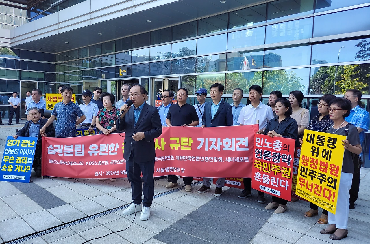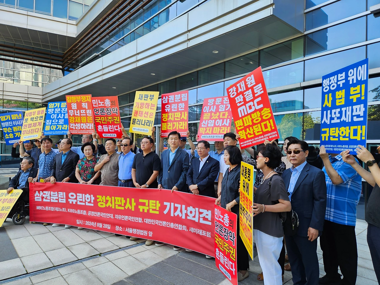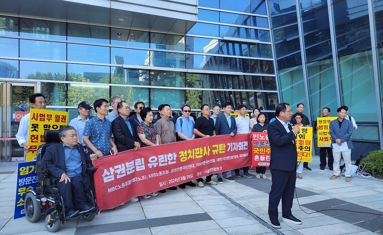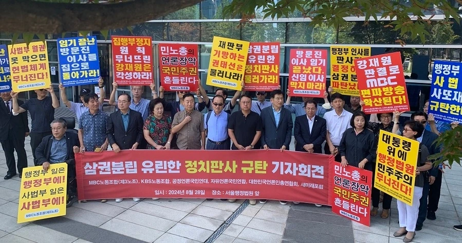 MBC노동조합(3노조)과 KBS노동조합(1노조), 공정언론국민연대(공언련), 대한민국언론인총연합회(언총), 자유언론국민연합, 새미래포럼 등 '공영방송 정상화 운동'을 벌이고 있는 언론·시민사회단체 회원들은 28일 오전 11시 서울 서초구 서울행정법원 앞에 모여 "'정치판사'의 '정치적 판결'을 강력 규탄한다"고 목소리를 높였다.