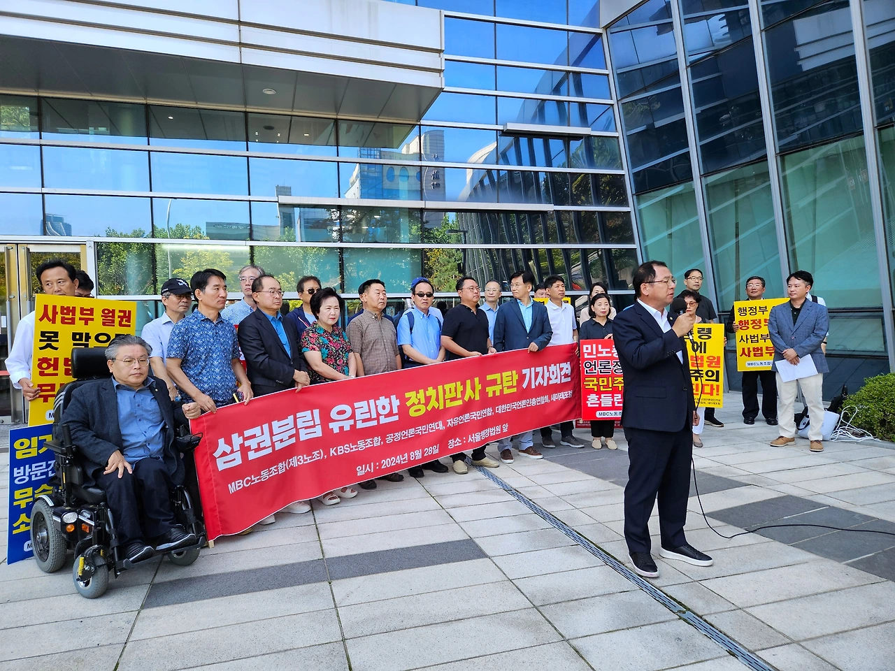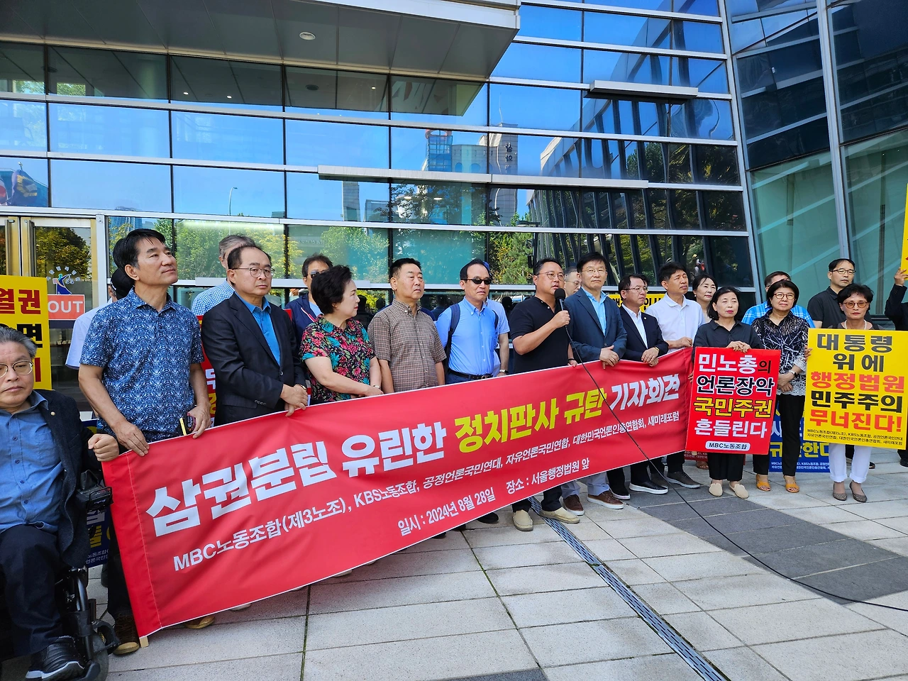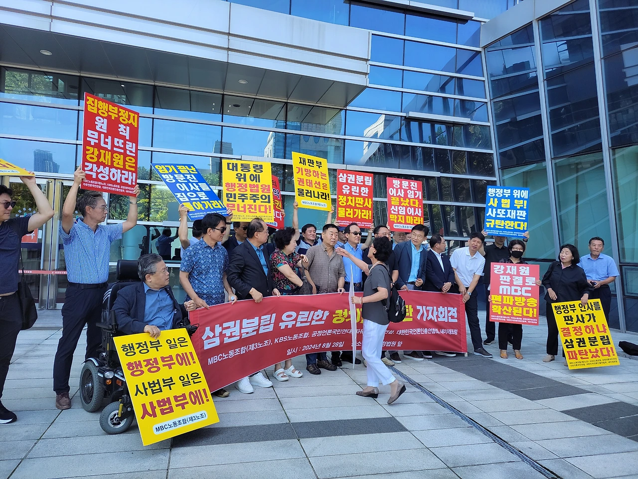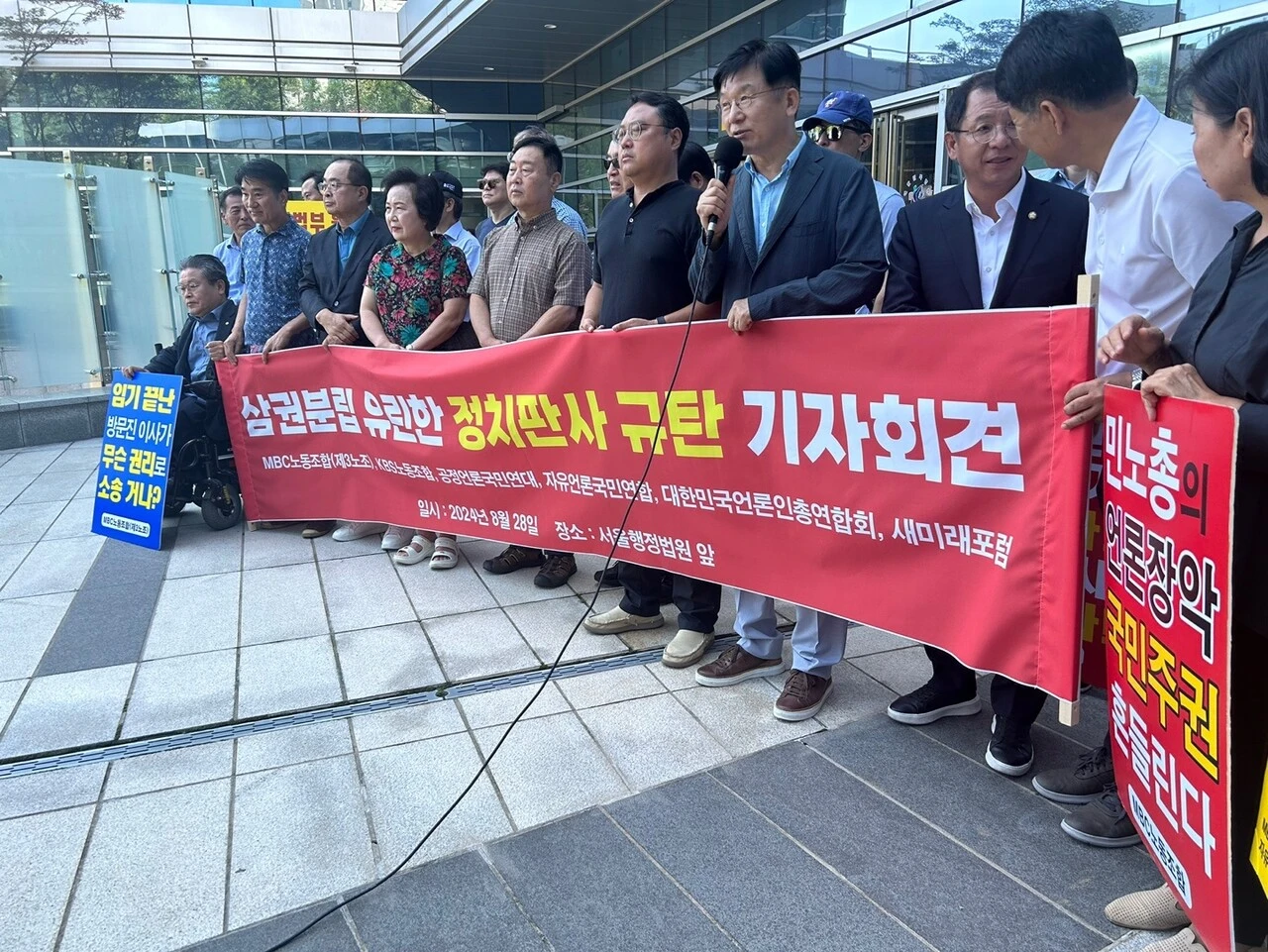 MBC노동조합(3노조)과 KBS노동조합(1노조), 공정언론국민연대(공언련), 대한민국언론인총연합회(언총), 자유언론국민연합, 새미래포럼 등 '공영방송 정상화 운동'을 벌이고 있는 언론·시민사회단체 회원들은 28일 오전 11시 서울 서초구 서울행정법원 앞에 모여 "'정치판사'의 '정치적 판결'을 강력 규탄한다"고 목소리를 높였다.