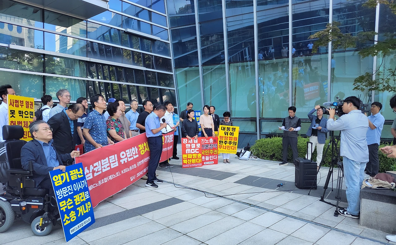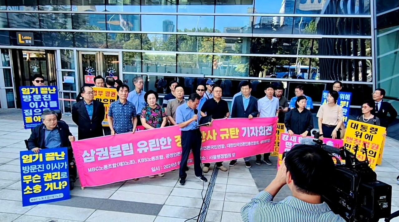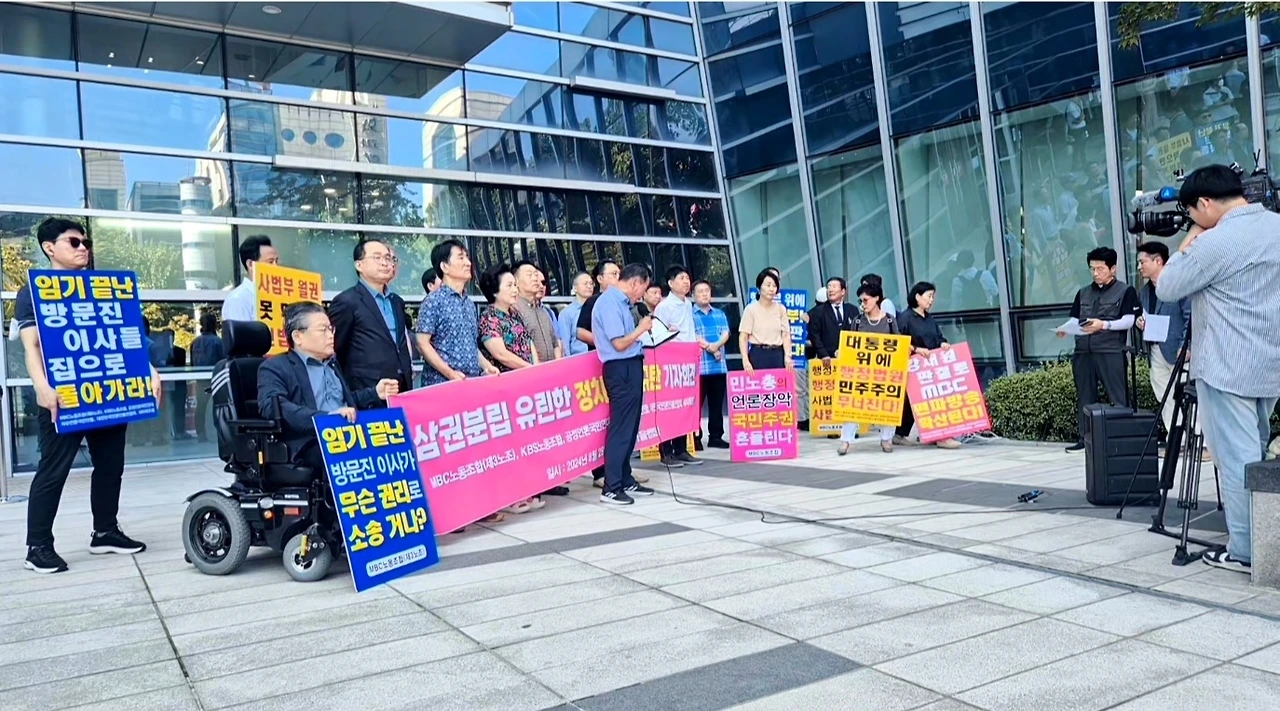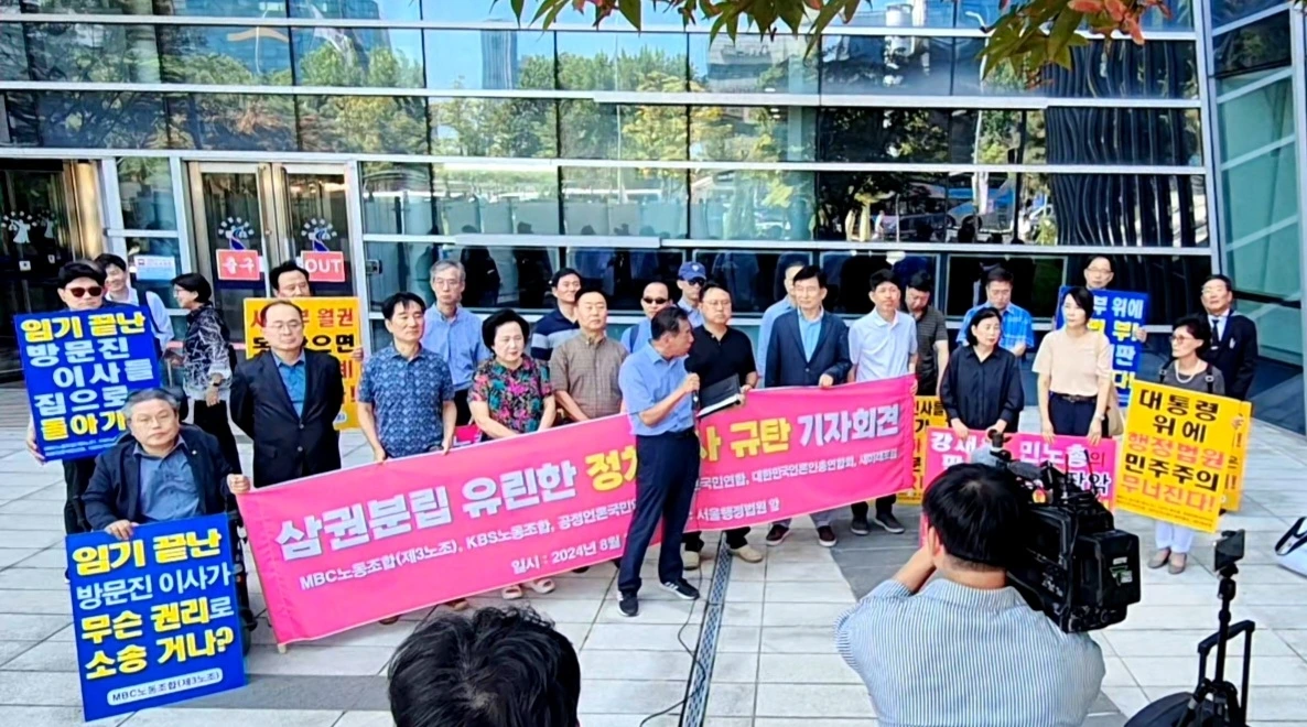 이어 "문재인 정부 당시 법원은 고영주 방문진 이사장과 고대영 KBS 사장, 강규형 KBS 이사의 위법한 해임에 대해 '집행부정지 원칙'을 고수, 가처분 소송은 모두 기각(또는 각하)하고 본안소송에서 해임 판결을 인용한 바 있다"며 지난 사례를 소개한 MBC노조 등은 "강 판사는 이처럼 확고하게 자리잡은 행정소송의 '집행부정지 원칙'을 침해해 문 정권 당시 민주당 6인, 국민의힘 3인 추천으로 구성된 '구 방문진 이사'들이 계속해서 이사직을 수행하라는 결정을 내렸다"고 짚었다.
