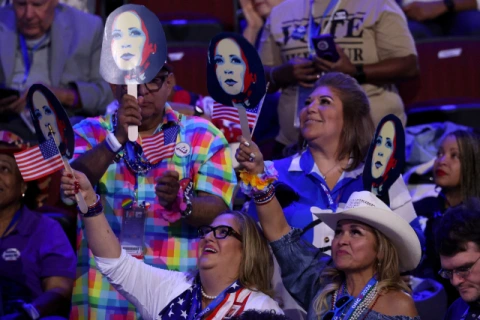 민주당 전당대회에서 해리스 사진·성조기 흔드는 지지자들. 연합뉴스 민주당 전당대회에서 해리스 사진·성조기 흔드는 지지자들. 연합뉴스