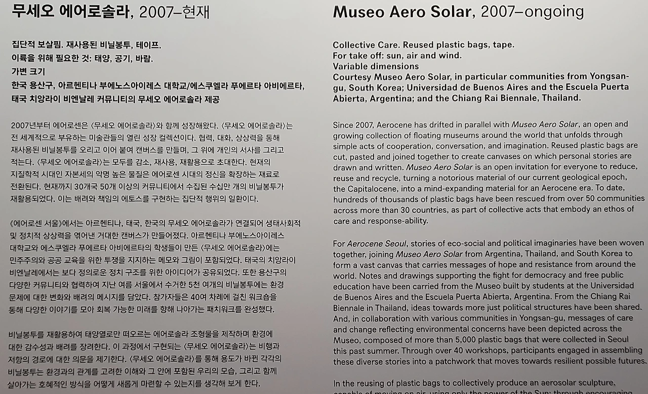 <무세오 에어로솔라>는 재사용된 비닐봉투로 만들어져 태양열로 공중에 떠 있는 뮤지엄인 ‘무세오 에어로솔라’를 제작하는 캠페인과 워크숍이다. 현재까지 <무세오 에어로솔라>는 2007년부터 25개국 50개 이상의 지역사회가 참여했고, 이번 서울에서는 캠페인을 통해 용산구 지역 내 다양한 커뮤니티가 협력하여 약 5, 000개의 비닐봉투를 수집한다.