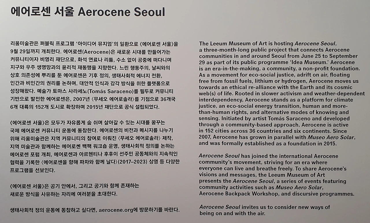 삼성문화재단(이사장 김황식)이 운영하는 리움미술관이 퍼블릭 프로그램 ‘아이디어 뮤지엄’의 일환으로 토마스 사라세노와 에어로센 파운데이션이 함께하는 《에어로센 서울》을 6월 25일부터 9월 29일까지 개최한다. / 화석 연료 없는 시대를 상상하며 공기와 함께 하기를 제안하다.