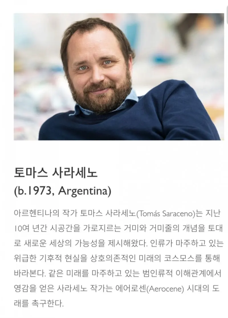 토마스 사라세노(b. 1973)는 아르헨티나 출신으로 독일 베를린에서 거주하며 작품 활동을 하고 있다. 그는 공기역학, 생물학, 천문학 등 다양한 과학 분야에서 영감을 받아 독창적인 예술작품을 창조해왔다. 그의 작품은 자연과 인간, 기술과 환경 사이의 상호작용을 탐구하며 관객들에게 새로운 시각적 경험을 제공해왔다.