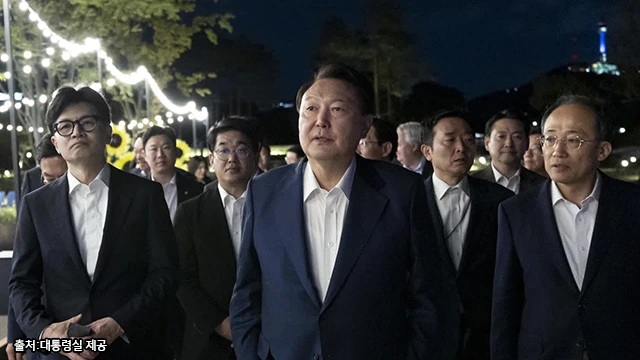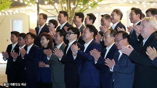 대통령실은 24일 윤석열 대통령과 한동훈 대표 등 국민의힘 지도부와의 만찬 회동 관련 영상을 제공하지 않고 기념 사진 4장만 공개했다. 풀(POOL·공동취재) 기자들의 현장 출입은 허용되지 않았고 사진은 대통령실 전속 사진사가 촬영한 사진이었다. 국민의 알 권리를 보장하지 않은 ‘깜깜이 만찬’이라는 지적이 나오고 있다.