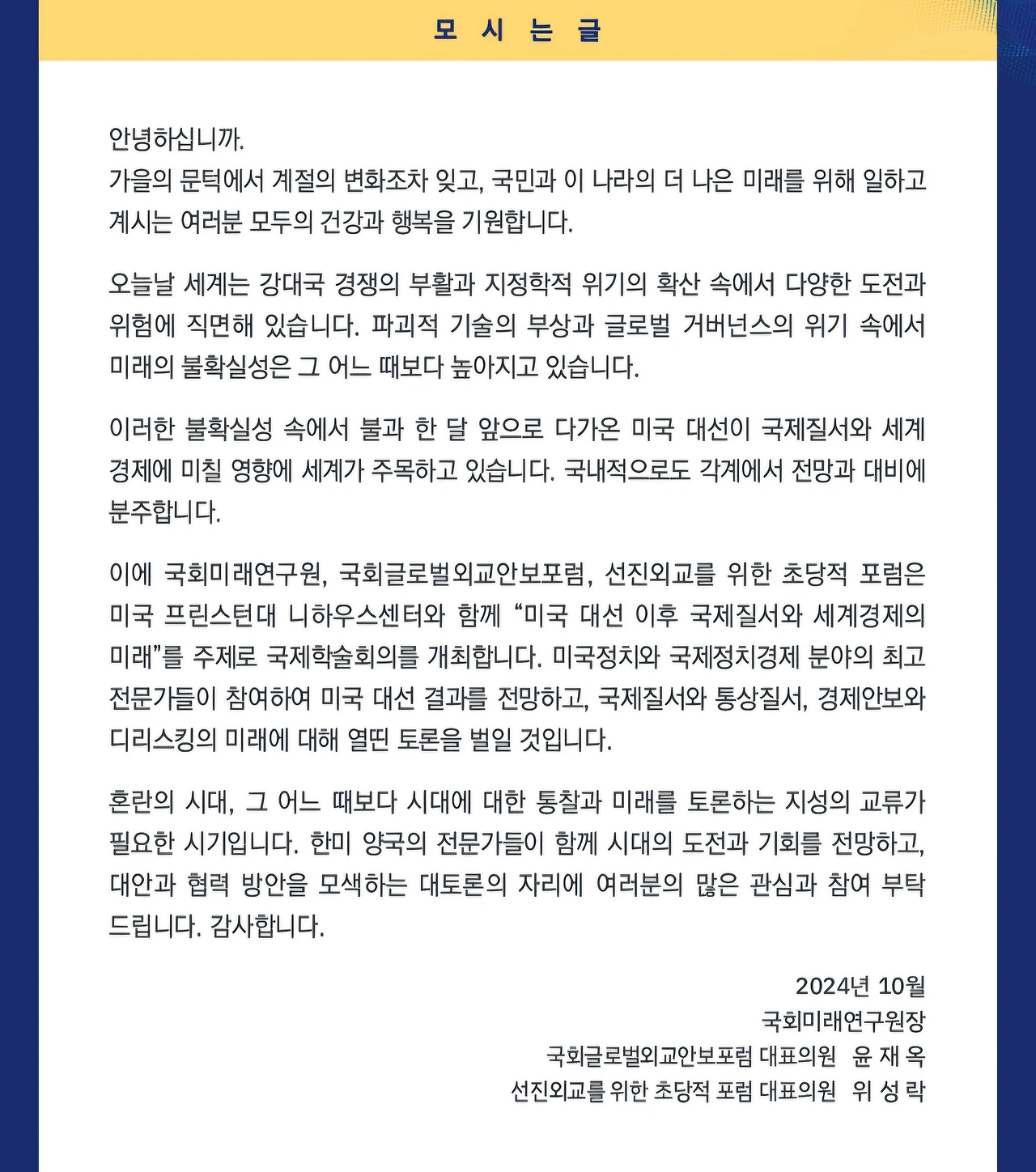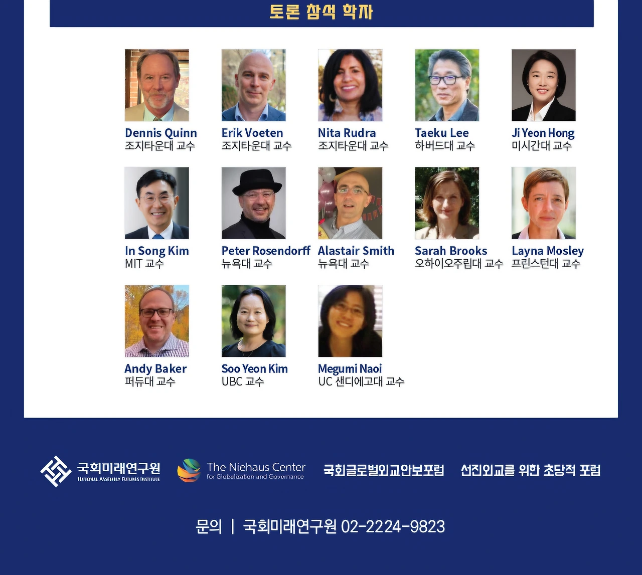 주최 : 국회미래연구원, The Niehaus Center(Princeton University), 국회글로벌외교안보포럼, 선진외교를 위한 초당적 포럼