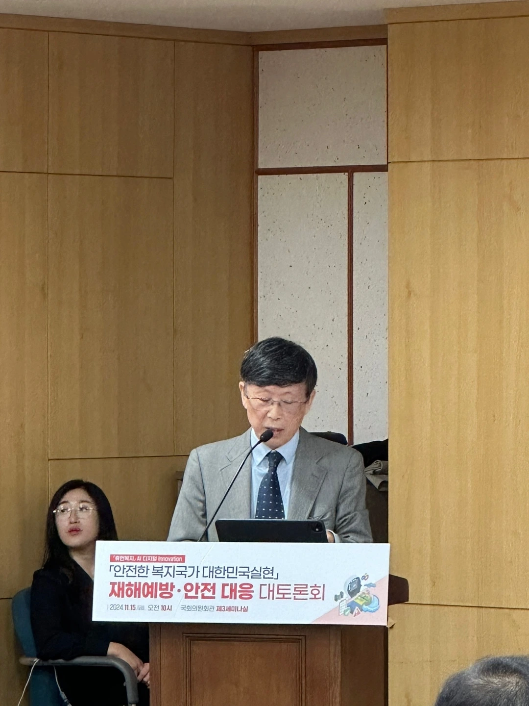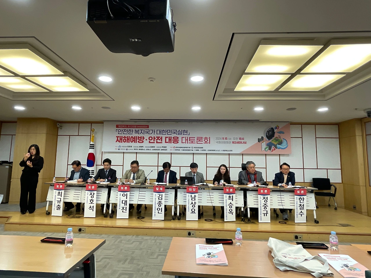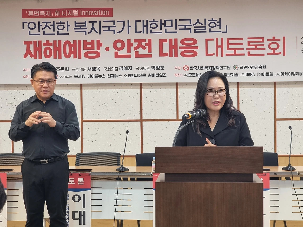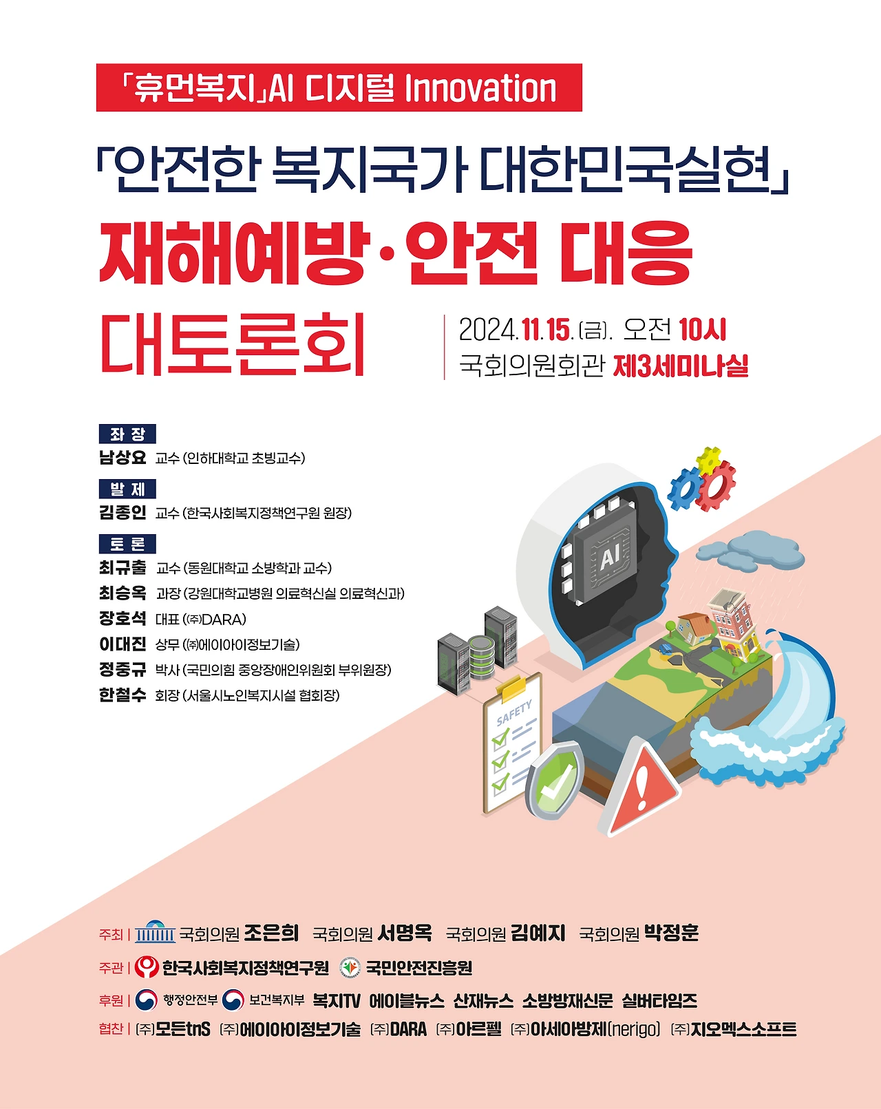 지난 11월 15일 국회의원회관 제3세미나실에서 ‘안전한 복지국가 대한민국 실현 재해예방·안전대응 국회 대토론회’가 조은희, 서명옥, 김예지, 박정훈 국회의원 주최, 한국사회복지정책연구원과 국민안전진흥원 주관, 행정안전부와 보건복지부 후원으로 열렸다. 이번 토론회는 "안전한 복지국가 대한민국 실현"라는 비전을 제시하고, AI 기술과 디지털 혁신을 통해 재해예방·안전대응을 강화하려는 취지로 개최됐다.