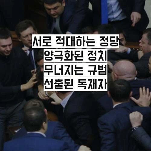 “정치인들은 극단적인 행동을 하는 게 자신에게 정치적으로 이익이 된다는 걸 안다. 그게 전체 시스템에 큰 피해를 준다. 그런데 보통 사회는 민주주의를 잃고 나서야 정치인들이 더 나은 방법을 찾았어야 한다는 걸 뒤늦게 깨닫는다. 정치인들이 절벽에서 떨어지기 전에 극단주의에서 스스로 벗어나는 건 매우 드문 일이다. 한국 민주주의는 꽤 견고하고 야당과 시민사회도 강하기 때문에 쉽게 무너지지는 않겠지만, 정치 양극화가 가져올 결과는 파괴적일 것이다. 몇 년 동안 계속돼 온 정치 양극화 현상과 제도적 전쟁은 한국 민주주의에 대한 실질적인 위협이다.”
