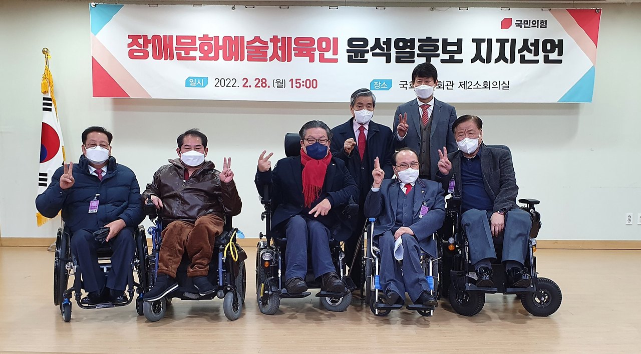 우리 장애문화예술체육인들은 장애문화예술체육인을 포함한 대한민국의 모든 장애인들이 국민으로서 부여받은 권리를 실현하고, 소외 받는 장애인의 의견이 존중받는 사회를 이룩하며, 궁극적으로 장애인을 위한 장애인계의 올바른 발전과 통합을 이루기 위해 대한민국의 희망찬 미래와 장애인이 행복한 미래를 책임지고 일궈낼 윤석열 대통령 후보를 적극 지지할 것을 천명합니다. 윤석열 대통령 후보와 끝까지 함께 하겠습니다.