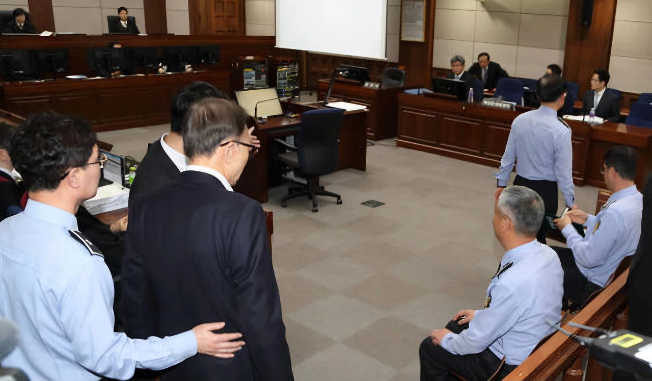 재판 장면이 공개되는 경우는 드물다. 그 이례적 경우 중 하나인 이명박 전 대통령의 재판 출석 모습을 참고해 법정의 내부 모습을 엿보자. 사진을 기준으로 왼쪽 윗부분에 재판장을 비롯한 판사들이 앉아 있고, 오른쪽 윗부분에 변호사들이 앉아 있다. 검사석은 맨 왼쪽 가운데 법정 경위 옆으로 살짝 보인다. 중앙포토