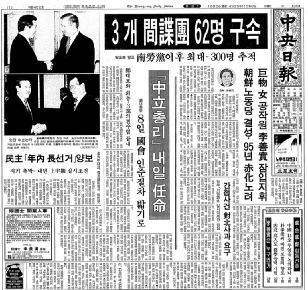 1992년의 중부지역당 사건을 보도한 중앙일보 지면. 공안이 기울기 전 마지막으로 쏘아올린 불꽃이었다. 중앙포토