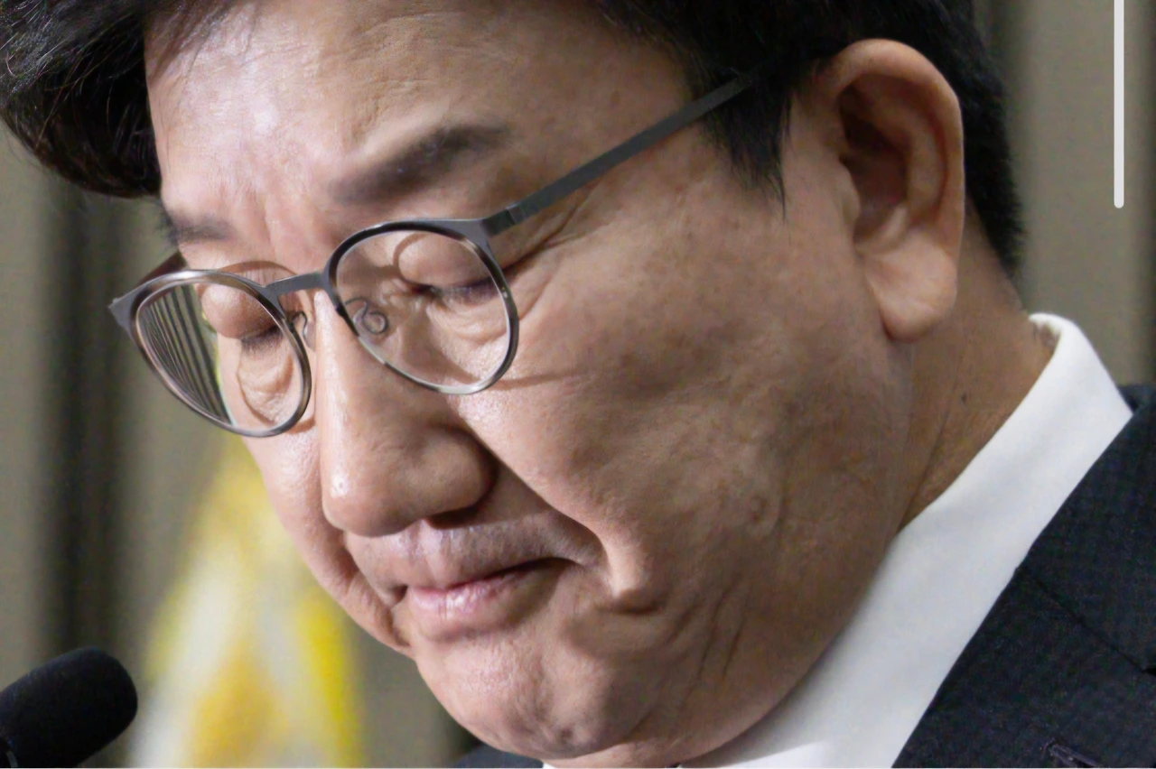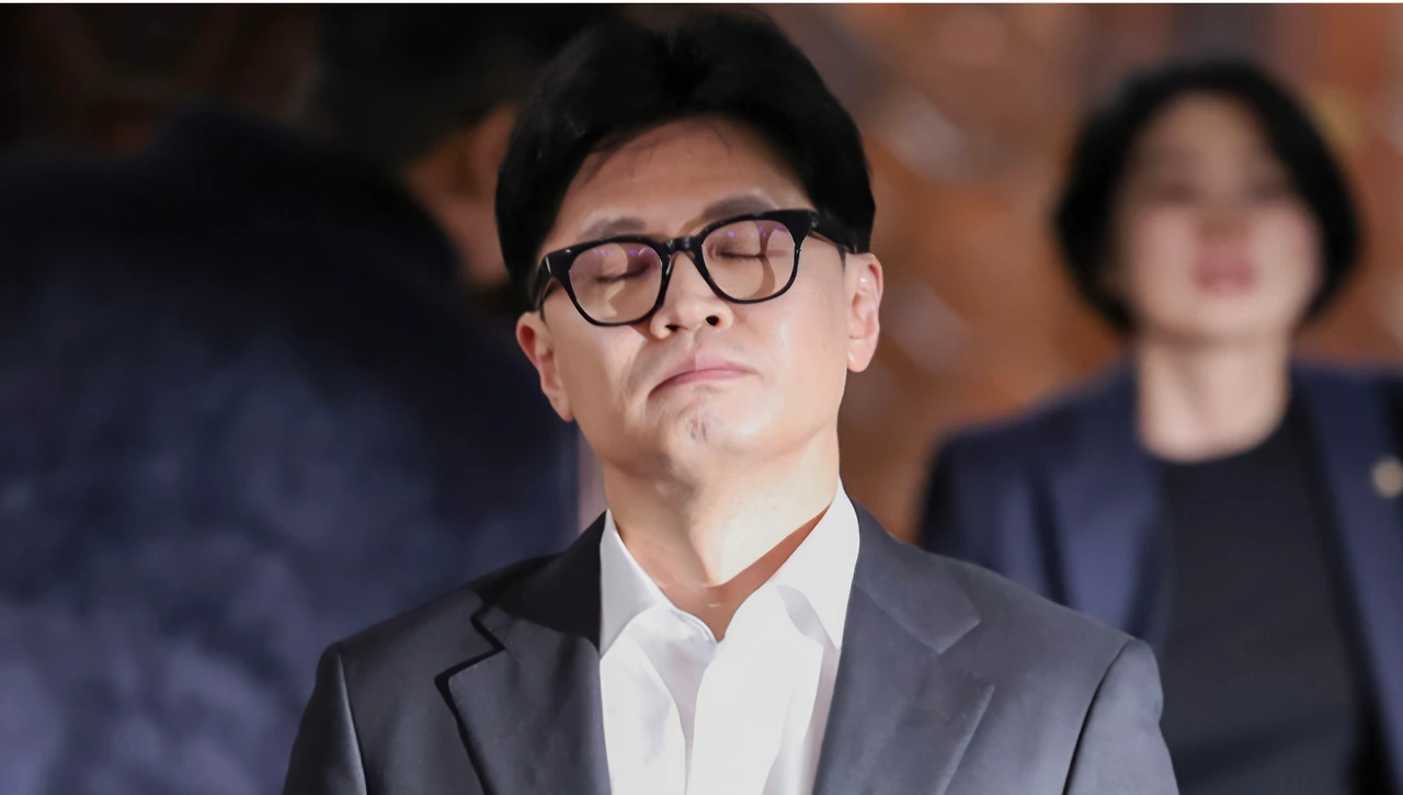 한동훈 국민의힘 대표가 2024년 12월 14일 서울 여의도 국회에서 윤석열 대통령에 대한 탄핵소추안 가결 관련 입장을 밝히기 전에 생각에 잠겨 있다. 뉴스1
