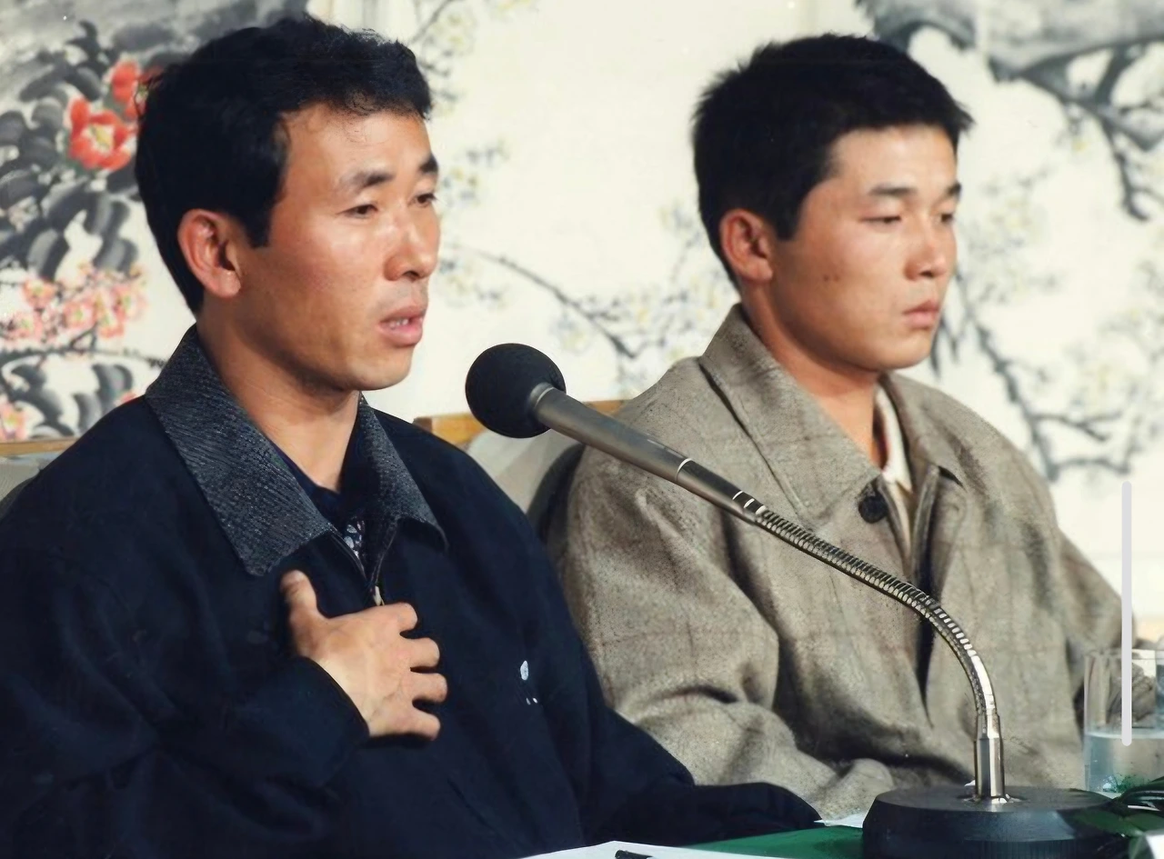 강릉 무장공비 침투 사건 당시 유일하게 생포됐던 리광수(왼쪽)가 1996년10월 29일 기자회견을 하고 있다. 오른쪽은 휴전선을 통해 귀순한 북한군 중사 곽경일. 중앙포토