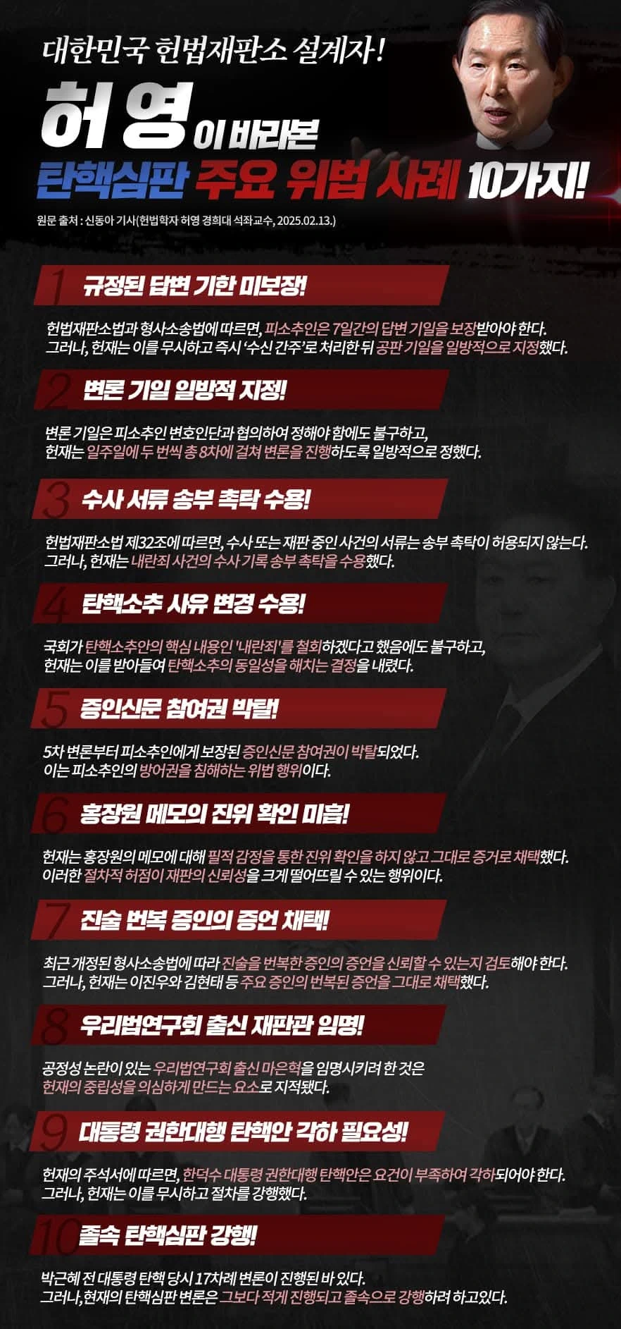 논란이 됐던 재판 일정을 헌재 마음대로 촉박하게 지정한다거나, 내란죄를 탄핵소추안에서 빼버린다거나, 부정선거 관련 증거요청을 모두 기각한다거나 등의 모든 결정이 TF에서 나온 것인지도 관심사다.