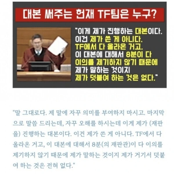헌법재판관에게 누가 대본을 제공하는지, 혹시 헌법재판연구원이 TF를 구성해서 모든 방향을 설정하고 헌법재판관은 그냥 꼭두각시에 불과한 것은 아닌지 온갖 추측이 난무하고 있다.