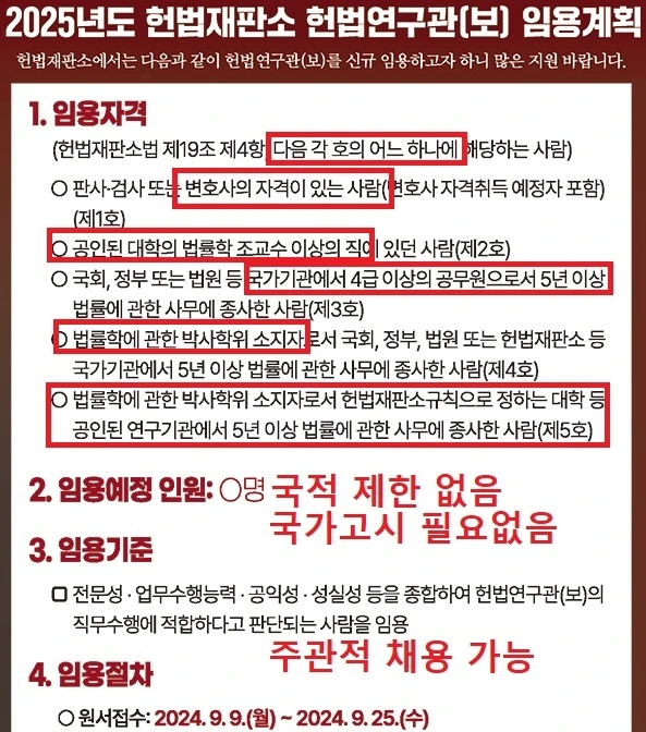 한편 "헌법연구관이 되기 위한 자격으로 대한민국 국적자가 아니어도 된다"는 의혹이 온라인 커뮤니티 등에 이미 제기되어 있다. 일단 채용공고에는 국적 제한 조건이 없다. 선관위 개표사무원으로 중국 국적자 또는 중국계 조선족이 들어올 수 있도록 길을 열어놓은 중앙선관위의 규정과 일맥상통하는 부분이어서 향후 크게 논란이 될 가능성이 높다.