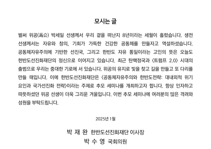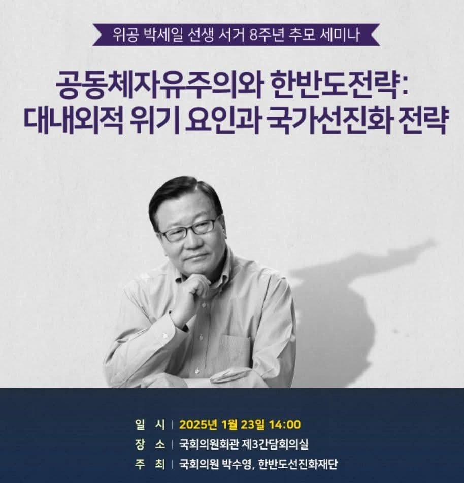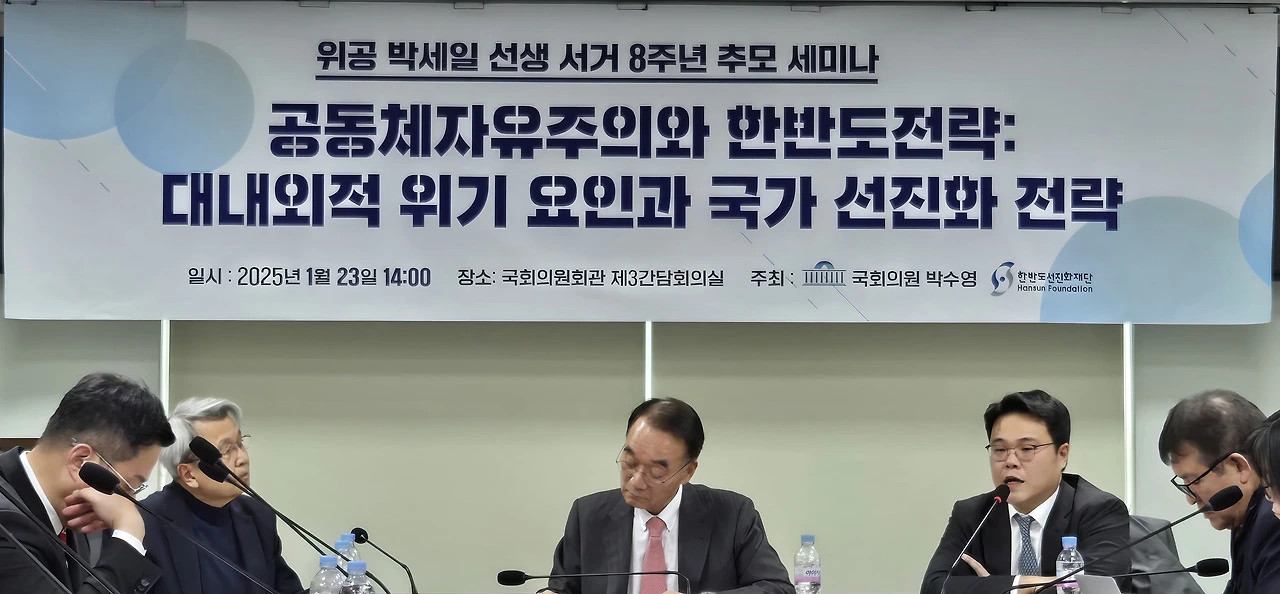 한국 보수를 대표하는 지식인이었던 그는 ‘개혁적 보수’라는 가치를 바탕으로 국가 목표와 정책 과제를 두루 제시했을 뿐 아니라 이를 달성하기 위한 철학적·역사적 기반을 연구했다. 선진화와 통일을 연구하는 개혁적 보수의 싱크탱크 ‘한반도선진화재단’ 또한 그가 창립했다. 탄핵 정국과 트럼프 2기 행정부 출범이 맞물려 혼란스러운 때에 위공 선생의 정신을 기리고 한반도 전략을 논의하는 자리가 마련됐다. 지난 1월 23일 국회 의원회관 제3간담회의실에서 국민의힘 박수영 의원실과 한반도선진화재단 주최로 ‘위공 박세일 선생 서거 8주년 추모 세미나’가 열렸다.