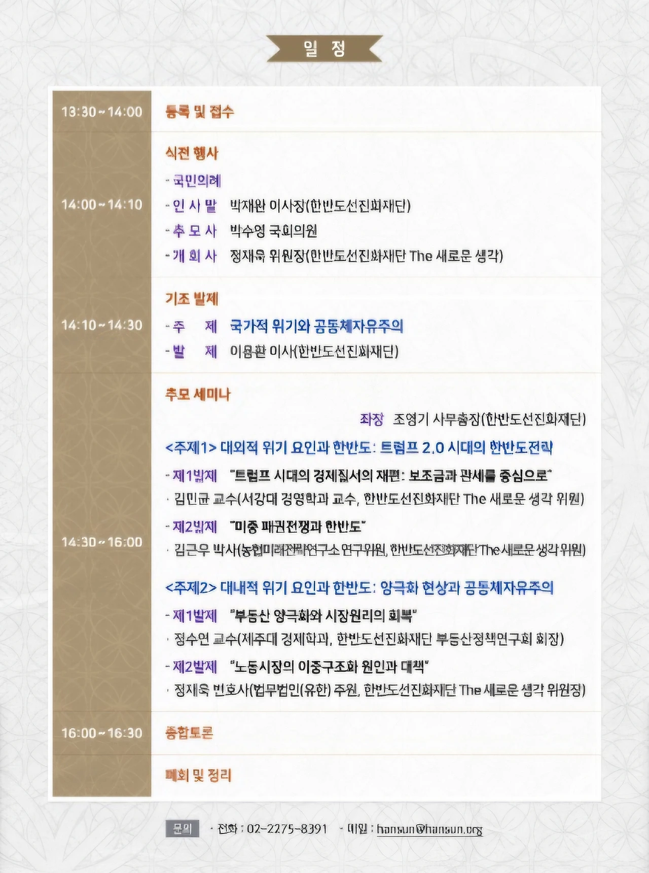 제1부 ‘대외적 위기 요인과 한반도: 트럼프 2.0시대의 한반도전략’ 주제발표에서는 김민균 서강대 경영학과 교수·한반도선진화재단 The새로운생각 위원이 트럼프 시대 경제질서의 재편이 한국 경제에 미칠 영향을 보조금과 관세를 중심으로 분석했다. 김 교수는 “트럼프 관세 정책이 공약 보다는 완화된 형태로 조심스레 예상하지만, 한국 기업들은 불확실성에 대비해 생산 기지를 여러 나라에 분산시키고, 신흥국 시장 진출 확대를 도모해야 한다. 보조금 정책의 경우 반도체, 전기차 분야에서 축소 또는 폐지할텐데, 이에 대응해 기술 경쟁력과 핵심엔지니어 기술 인력의 파이프라인을 확보하고, 운영비용을 절감해야 한다”고 설명했다. 특히 “정부는 가장 부족한 부분 중 하나인 통상 외교 지원을 증대시켜야 한다”고 제언했다.