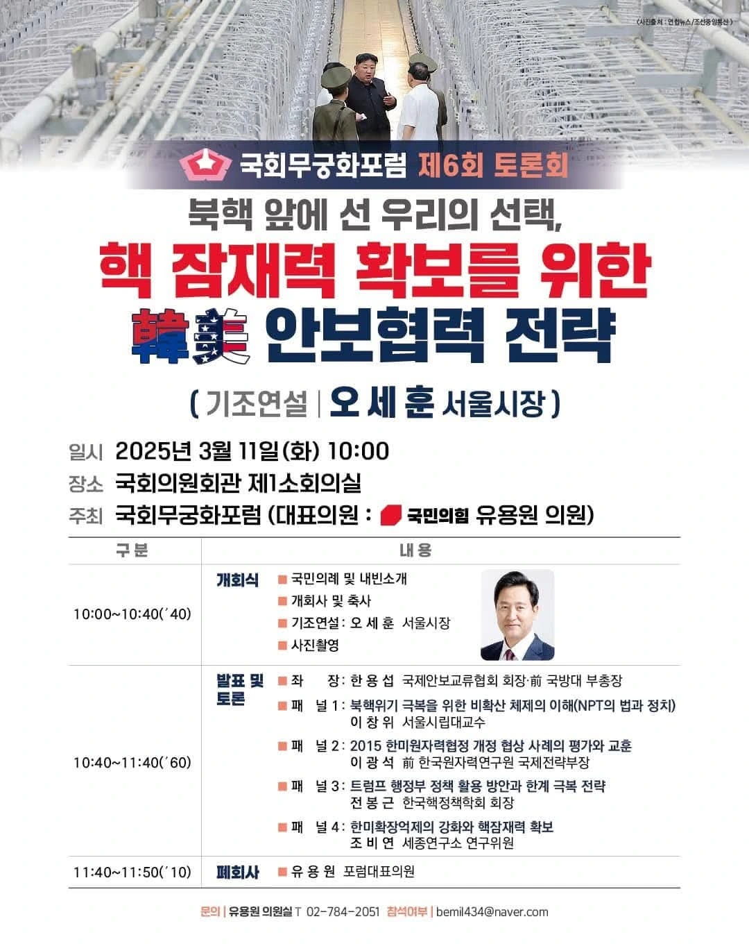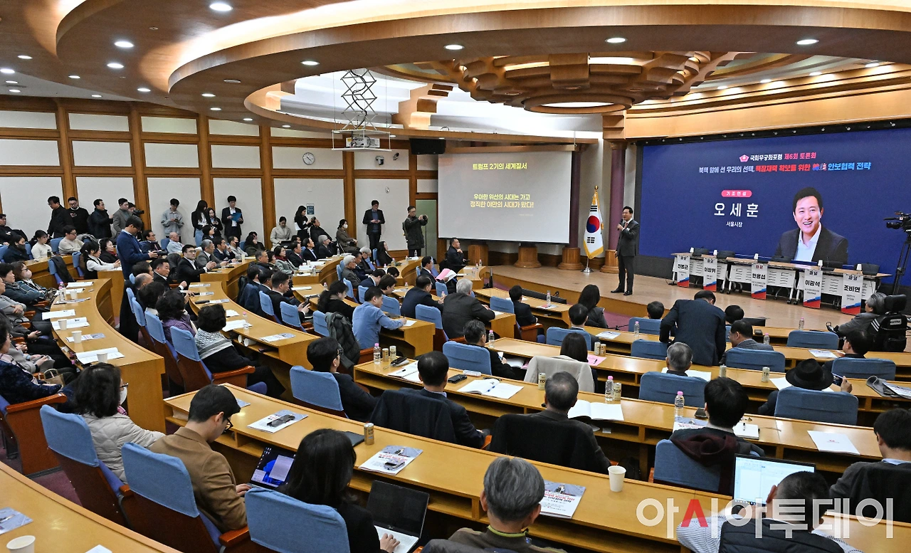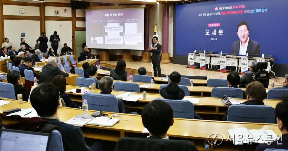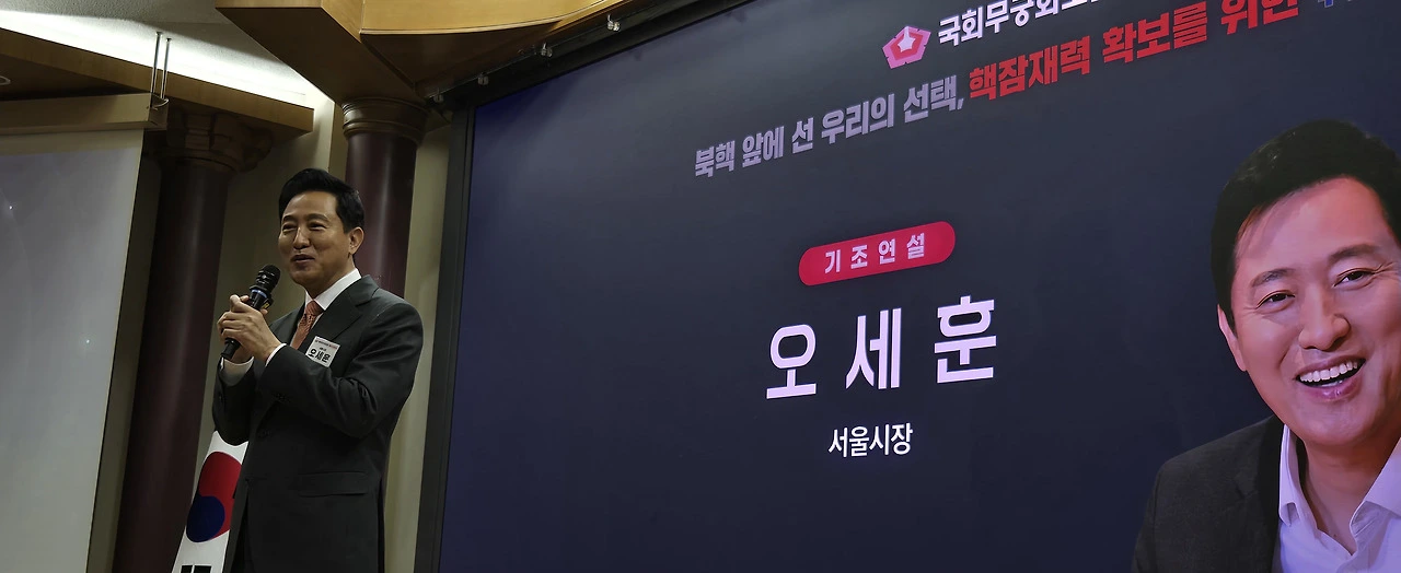 오세훈 서울시장은 이날 국회 의원회관에서 국민의힘 유용원 의원 주최로 열린 국회무궁화포럼 제6회 토론회 기조발제에서 “NPT(핵확산금지조약) 하에서 평화적으로 우라늄을 농축할 권한이 있는데 우리는 미국 제재 때문에 그조차 못 하고 있어 불공평하다”고 주장했다.