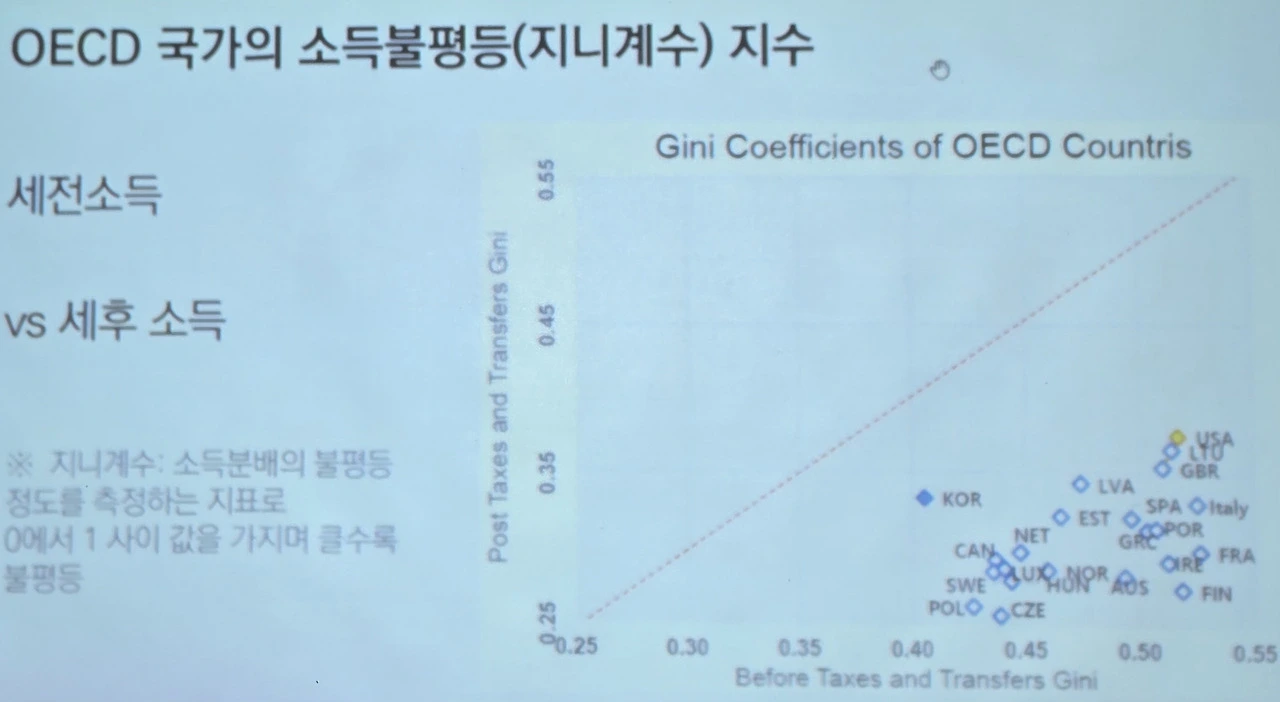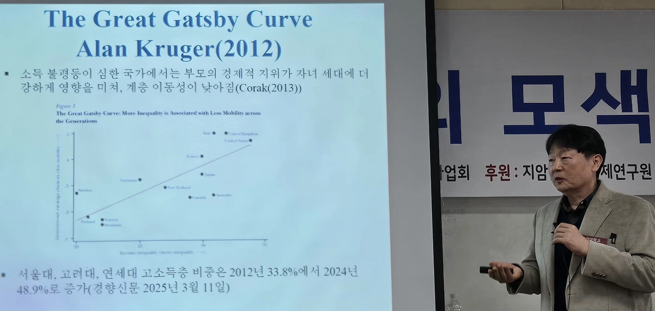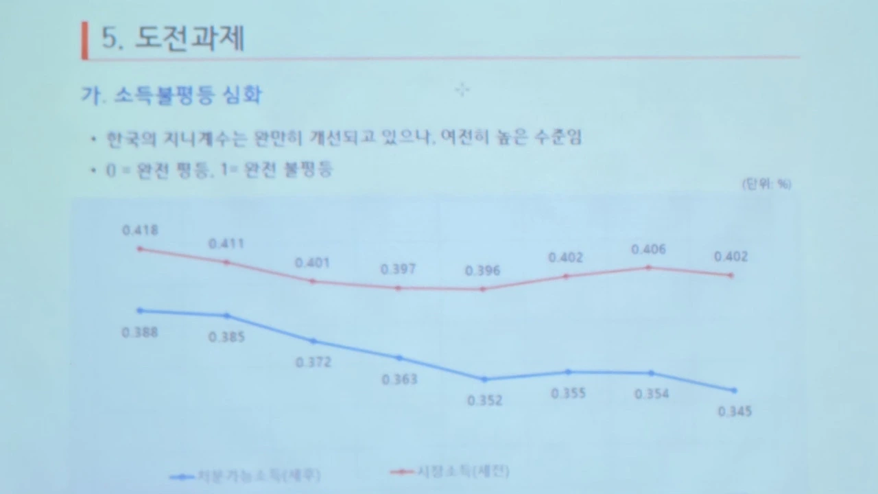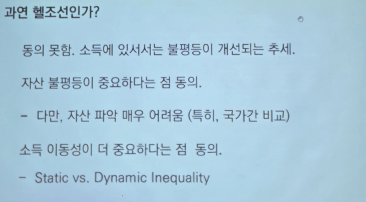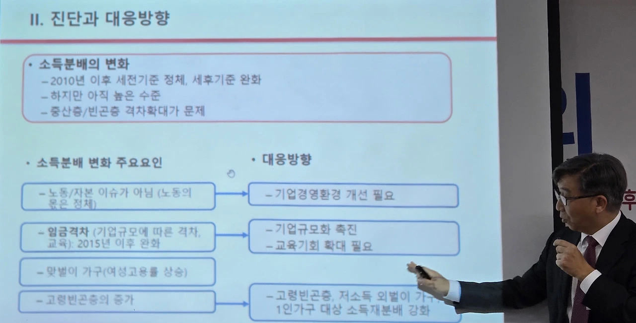 그는 "그럼에도 체감되지 않는 것은 소득이동성 이유가 크다고 생각한다"며 "단순하게 우리나라의 부자 10명 중 자주성가 1세대는 2명, 부모로부터 물려받은 경우가 8명인데 미국은 8명 대 2명이다. 이런 의미에서 젊은이들이 느끼는 불평등이 큰 것이 아닌가 생각한다"고 말했다. 이어 "우리는 이해관계 때문에 수입 제한이 많아서 생필품 물가가 비싼데, 이런 데서 서민들이 느끼는 체감 차이도 크다고 보인다"고 짚었다.