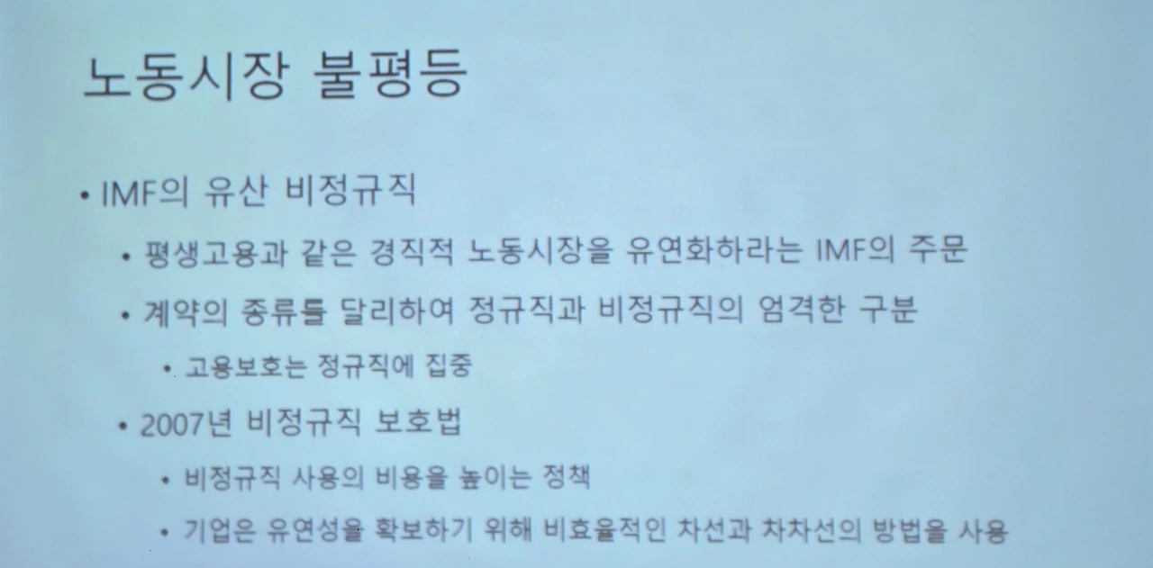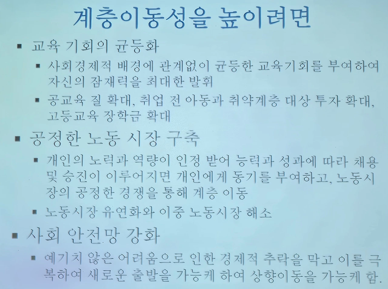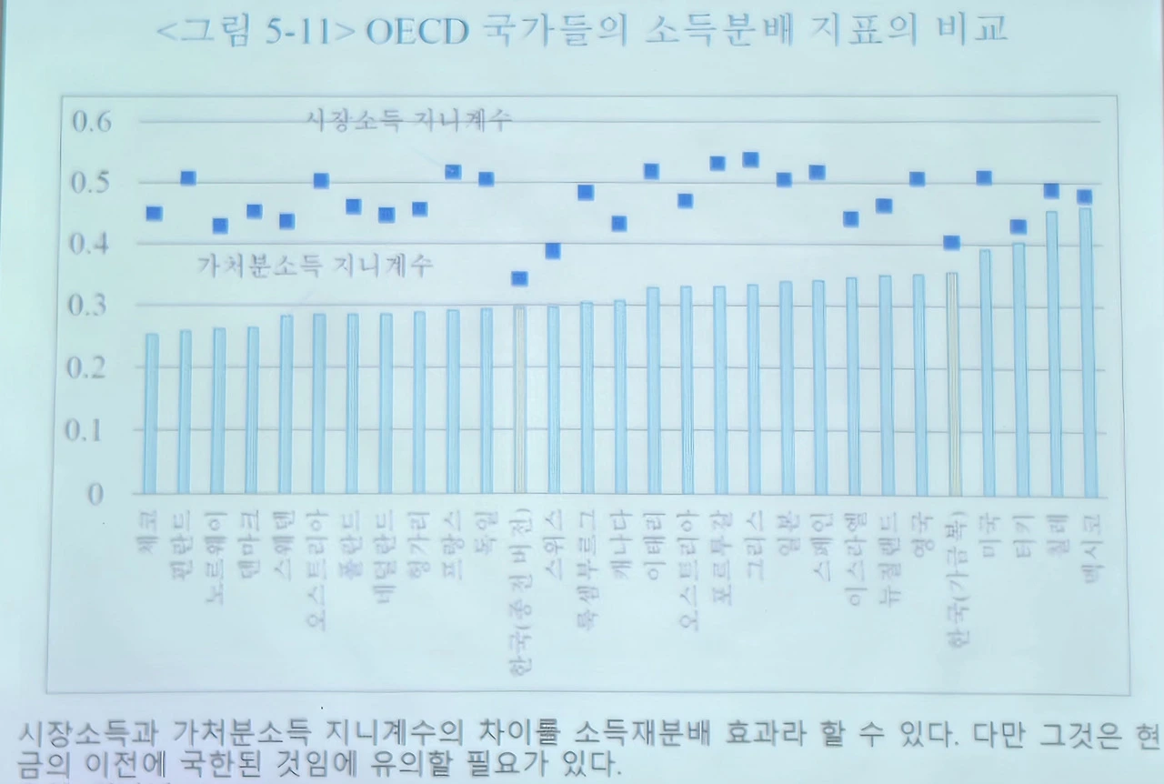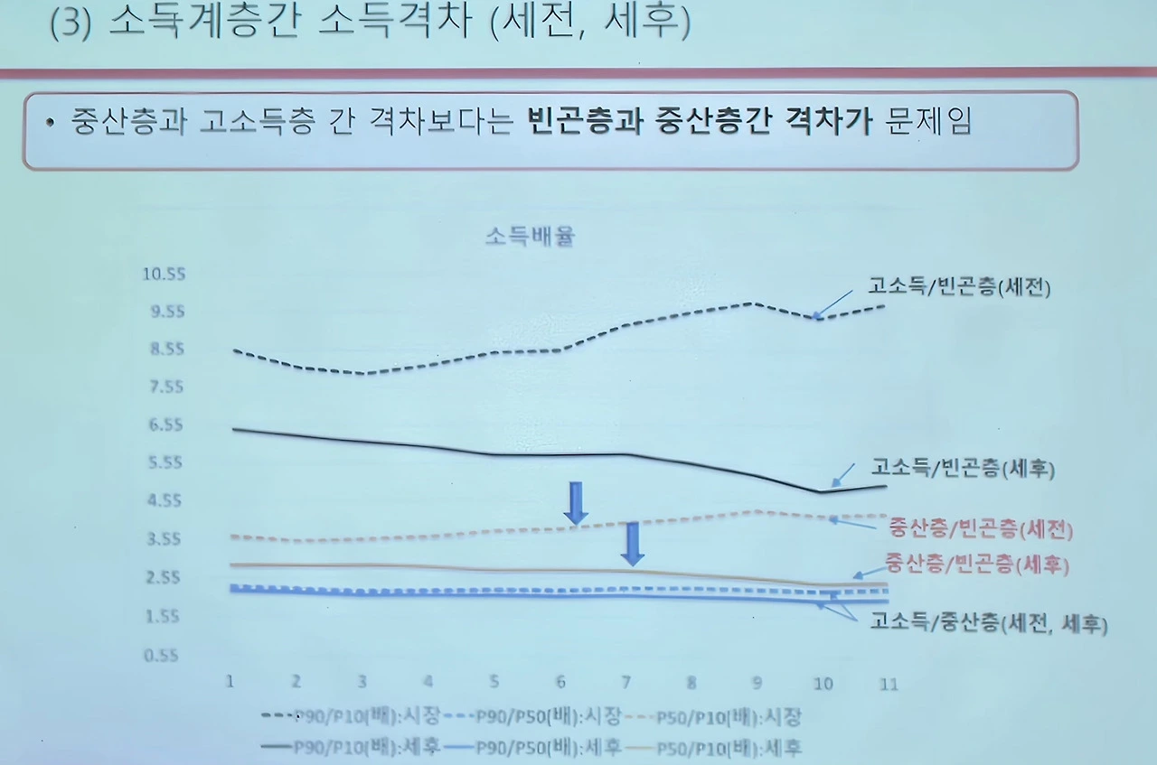 그는 "그럼에도 체감되지 않는 것은 소득이동성 이유가 크다고 생각한다"며 "단순하게 우리나라의 부자 10명 중 자주성가 1세대는 2명, 부모로부터 물려받은 경우가 8명인데 미국은 8명 대 2명이다. 이런 의미에서 젊은이들이 느끼는 불평등이 큰 것이 아닌가 생각한다"고 말했다. 이어 "우리는 이해관계 때문에 수입 제한이 많아서 생필품 물가가 비싼데, 이런 데서 서민들이 느끼는 체감 차이도 크다고 보인다"고 짚었다.