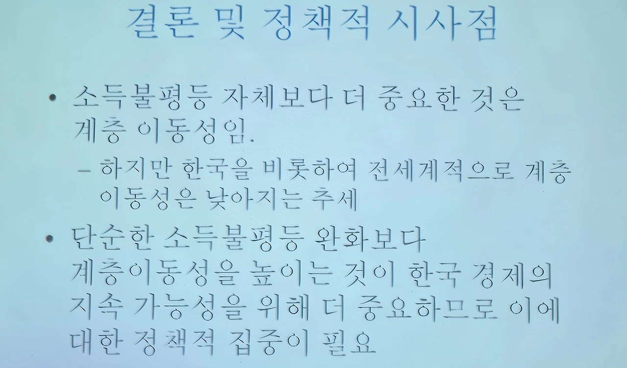 장용성 한국은행 금융통화위원은 "우리나라의 지니계수는 실제로는 개선되는 추세에 있다"며 "그런데도 불평등을 느끼는 것은 소득이동성(계층이동성) 때문"이라고 분석했다.